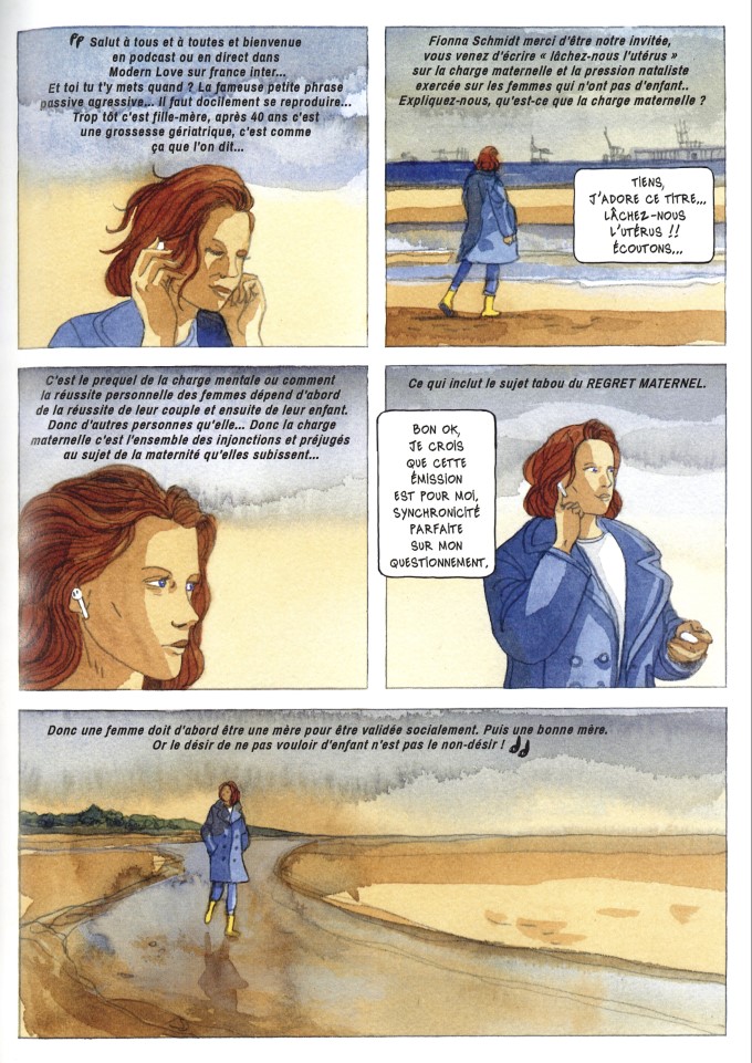 En marchant toute seule sur la plage déserte, Juliette revient sur sa vie, les choix qu’elle a fait au fil des ans. Pour autant, elle ne pense pas avoir loupé le coche. Tout ce qu’elle a fait, toutes les décisions qu’elle a prises, c’était ce qu’il fallait décider à ces moments-là. Ça fait deux ans qu’elle a entamé le protocole PMA. Comme une synchronicité, les podcasts sur lesquels elle tombe parlent de ce sujet. C’est un SMS de sa maman qui va lui faire enfin couler des larmes, un SMS anodin à propos de crêpes qu’elle ne pourra pas manger parce qu’elle est à Honfleur et ses parents à Paris, un immense message d’amour dans des mots du quotidien, comme pour dire « on est là ». C’est l’amour d’une maman pour sa fille, celui qu’elle ne pourra pas donner. Impossible. Juliette s’intéresse à l’épigénétique. Il reste peut-être une piste…