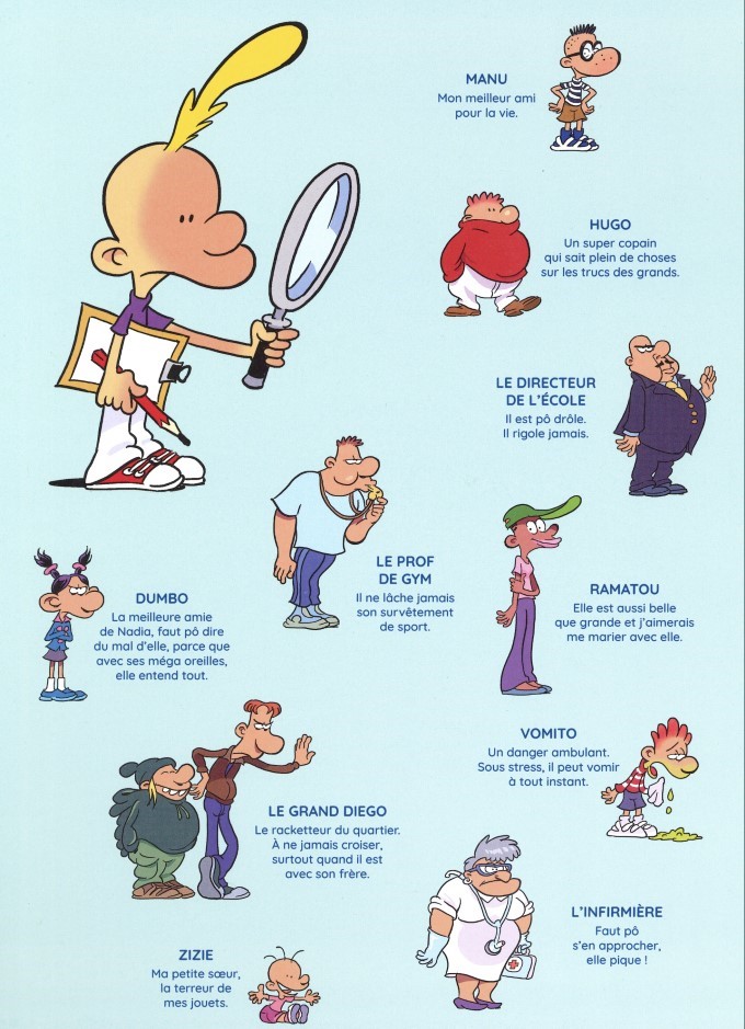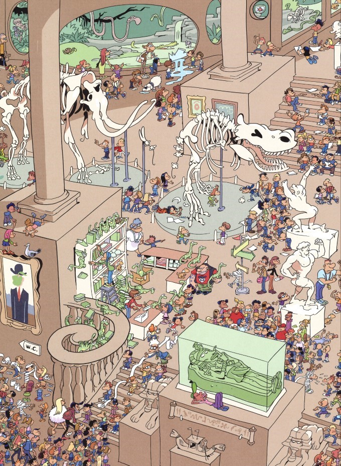 Sobrement (!?) et simplement, l’aventure commence dans la chambre, avec des peluches et des figurines de dessins animés, des slips et de la bouffe alors qu’il ne devrait pas y en avoir dans cet endroit. Un fois prêt, c’est parti pour l’école, l’occasion de retrouver Hugo, Manu, Nadia et tous les autres. Rassurez-vous, on ne fera pas de maths. La page est l’occasion de faire un cross-over avec la série Dad. Ski, luge, surf des neiges : non, on n’est pas dans Franky Snow, mais il y aura du remonte-pentes aux sports d’hiver. Il faudra mieux se tenir au Musée. Tout regarder et ne rien toucher. C’est nul ! Bon, pendant la visite libre, il y a moins de surveillance… Il y a des squelettes plus vieux que la maîtresse.
