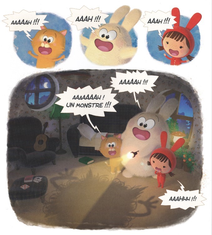 C’est au moment de se coucher que Finette va comprendre la problématique. Philibert, l’aventurier de la forêt, symbole de vaillance et de courage, lui demande de laisser une lumière allumée et la porte entrouverte. Le chat a peur du noir. C’est donc pour ça qu’il ne venait pas aux soirées pyjama. C’est plus fort que lui. Il n’y arrive pas. Après l’histoire du soir, il va quand même bien falloir se coucher. Les terreurs de Philibert vont empêcher la nuit d’être calme. C’est quand Chifoumi va vérifier qu’il n’y a aucun monstre dans le placard et rien sous le canapé qu’il va éternuer et se transformer en Chichifoumi. Le grand lapin résoudra-t-il les phobies du trouillard ?