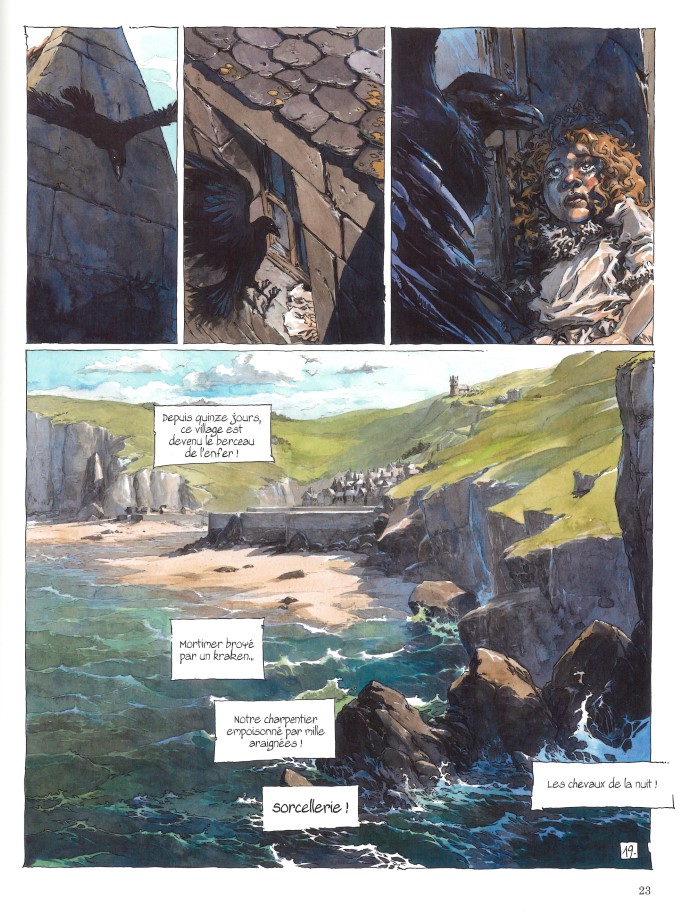 Avec Deryn Du, le but de Guillaume Sorel était de susciter la peur en bande dessinée, peut-être la sensation la plus complexe à retranscrire par ce média. C’était aussi le défi de Luc Brunschwig quand il a écrit L’esprit de Warren à la fin des années 90 avec Servain chez Delcourt. Chacun dans son genre, l’un comme l’autre a réussi son coup. Lorsque Gwilym s’endort avec son livre au pied d’un arbre, on ne peut s’empêcher d’avoir une pensée pour Alice au pays des merveilles, au tout début de l’histoire de Lewis Carroll. La suite n’est pas à mettre entre les mains des disneyphiles. On quitte très rapidement Carroll pour faire un tour chez Lovecraft et Edgar Allan Poe. Deryn Du s’inspire de la littérature et du cinéma britannique fantastique. Sorel en a eu l’idée après avoir regardé le film Opération peur de Mario Bava. Le projet aura mis vingt ans à se concrétiser. Sorel installe des séquences de calme pour mieux surprendre. Un léger doute est fugace sur du rêve. Le surnaturel se concrétise.