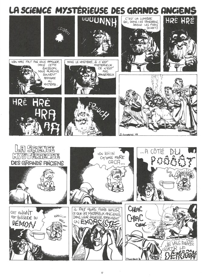 Les grands anciens présentent leur science mystérieuse, de la lumière des ténèbres au caca dans le pot. L’horreur est au rendez-vous avec les vampires de la grotte et les sortilèges du Comte Karlgraf, chauds, très chauds. Il y a de l’absurde dans les histoires de Goossens. L’auteur met très souvent ses acteurs en décalage. Les habitants de l’immeuble du guardian sont là pour le rappeler, ou plutôt Goossens est là pour le leur rappeler. Le petit Poucet étant décédé, c’est dans une rétrospective qu’on va le retrouver. Le Père Noël, lui, est bien vivant. Il prend un gorgeon au bar avant de reprendre sa tournée. Le cinéma avec Clark Gable, la musique avec les Beatles, la littérature avec San Antonio, Goossens tord et distord toute forme de culture.