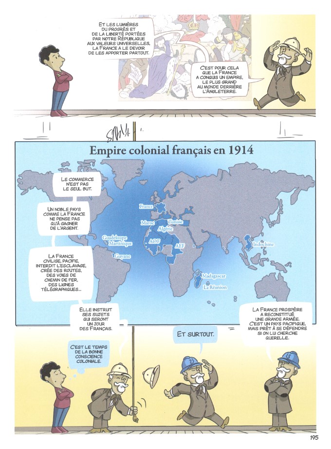 Chaque chapitre s’ouvre par une frise historique qui replace les événements auxquels on va assister les uns après les autres. Ernest Lavisse donne ensuite son cours comme sur la scène d’un théâtre, ou plutôt l’estrade d’une salle de classe, avant d’être interrompu, voire recadré par l’enseignante d’aujourd’hui. Jean-Yves Le Naour s’attache aux dialogues, très importants. Chaque mot a son poids lorsqu’on parle d’Histoire. Marko s’intéresse aux personnages et utilise le moins de décor possible. La culture du lecteur fait le reste pour qu’il ne manque rien. On ne va pas retracer ici les époques une par une. On remarque que la problématique des relations franco-allemandes est récurrente au milieu du reste. Après avoir tout lu, au final, on se rend compte que l’on ne tient pas dans les mains un livre sur l’Histoire, mais bel et bien le contenu d’un débat sur l’Histoire.