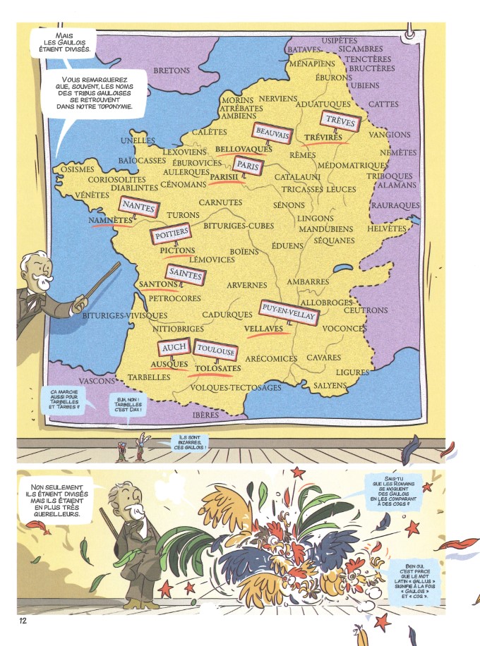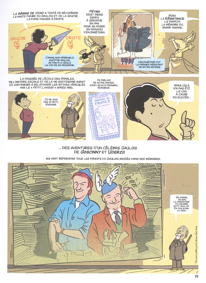 La leçon ne sera pas toujours aisée à enseigner pour Ernest Lavisse. Les auteurs lui collent une contradictrice en la personne d’une enseignante contemporaine qui va mettre en exergue les échos du passé dans le présent. Si Lavisse commence son histoire au temps des gaulois et non pas des francs, c’est parce qu’il y a une raison. On vous la laisse découvrir dans le livre. On va voir comment l’image faussée de nos ancêtres est utilisée par les politiciens actuels. Avec les invasions barbares, on s’intéresse à Clovis et on verra pourquoi et comment son image a été reléguée au second plan par rapport à celle de Vercingétorix, tout comme les rois carolingiens inspirent beaucoup plus de références que les rois mérovingiens. Au fil des chapitres, on découvre comment la classe politique s’est saisie des moments qu’elle a voulu de l’Histoire. On pense entre autres au Front National qui s’est accaparé l’image de Jeanne d’Arc.