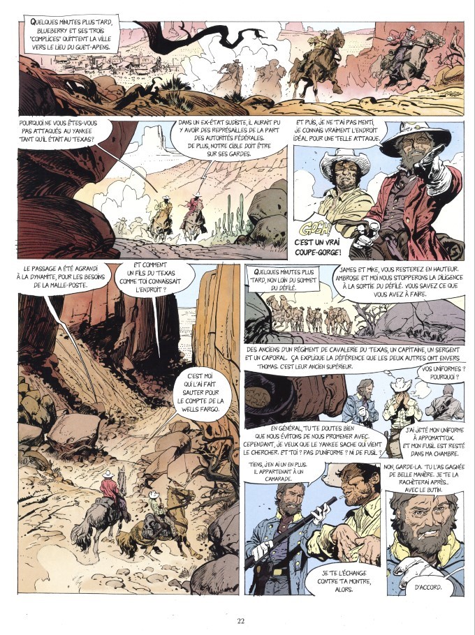 Avant chaque récit, les auteurs se souviennent du moment où, jeunes lecteurs pour la plupart, ils ont découvert la série. A 15 ans, Thierry Martin est impressionné par Le spectre aux balles d’or. Lecteur de Pilote, Al Coutelis montre le choc que ça a été à sa parution en 1963, sur les pas de Jijé avant que Giraud ne prenne son autonomie graphique. Ado, Olivier Taduc est subjugué par la couverture d’Angel Face qu’il feuillette, trop tôt peut-être, un rendez-vous manqué qu’il concrétisera plus tard avec Le cheval de fer. Quant à Fred Duval, son album préféré est Nez cassé. Tous ces titres, et les autres, font encore rêver. C’est Corentin Rouge qui clôt le collectif avec un Blueberry vieillissant voyant l’avenir débarquer chez lui avec les conséquences du passé.