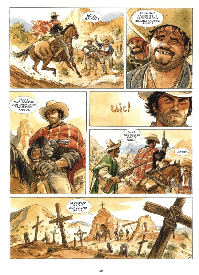 Olivier Bocquet et Anlor ouvrent le bal en plongeant, non pas dans la jeunesse, mais carrément dans l’enfance du héros. Pour le fidèle Michel Blanc-Dumont, Jean-François Vivier écrit une rencontre avec Jonathan Cartland. Vincent Brugeas et Ronan Toulhoat organisent une embuscade qui ne va pas se dérouler comme prévu. Il aurait été dommage qu’Enrico Marini ne mette pas en scène Chihuahua Pearl, avec laquelle il joue la carte de l’humour, tout comme Dominique Bertail, mais lui avec Jim Mc Clure. Il n’est pas étonnant que la meilleure histoire soit signée du duo qui a récemment remis le western au pinacle avec Jusqu’au dernier. Jérôme Félix et Paul Gastine nous invitent à une partie de cartes comme on n’a jamais joué. Ils sont en tout vingt-neuf auteurs à participer à l’ouvrage, la plupart avec des histoires courtes, les autres avec des illustrations, comme Blutch et ses magnifiques revisites de couverture.
