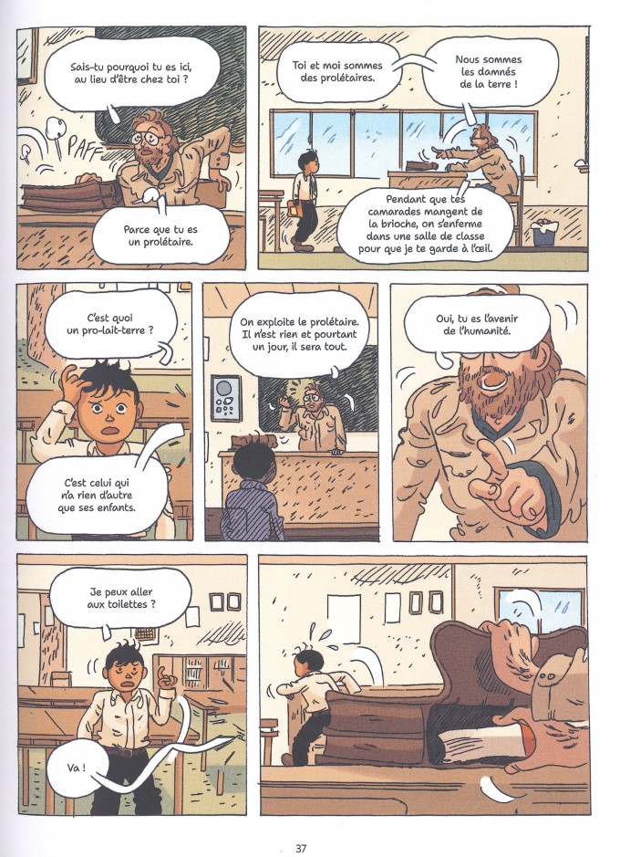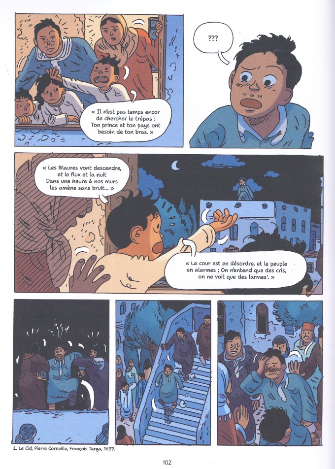 Carbone adapte ici le roman de Fouad Laroui paru chez Julliard en 2010 basé sur les souvenirs de l’auteur. C’est ce dernier qui signe la préface de cette transposition en BD, préface où il en dévoile trop et qu’il aurait été préférable de lire plutôt en postface. C’est un détail, mais éviter de la lire avant, vous trouverez plus de plaisir et de surprise à la lecture de l’album. Ancienne enseignante, Carbone connaît bien le milieu scolaire. Même si c’est ici dans le secondaire, elle s’attache au point de vue de l’élève parmi ses pairs et dans un monde d’adultes pas toujours compréhensifs. Sous les couleurs chaudes d’Alessandra Alexakis, la dessinatrice italienne BeneDi adopte un semi-réalisme tendre. Elle donne toute l’émotion possible comme dans la scène aussi drôle qu’émouvante du retour éphémère au village pour un mariage, qui va être une réelle prise de conscience pour Mehdi.