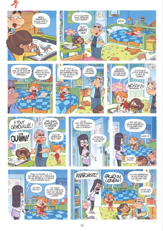 Du côté des filles, Bébérénice continue de grandir. Elle entre à l’école. Et pas question d’être en retard. Elle met un coup de boost à son père pour qu’il la prépare le plus vite possible. Roxana apprend à se débrouiller par elle-même. Dad ne peut pas s’occuper de tout, alors, plutôt que de l’embêter à prendre rendez-vous chez le coiffeur, ben, elle se coupe les cheveux toute seule. Ondine s’intéresse à l’Intelligence Artificielle. L’important n’est plus de connaître les réponses. Il faut savoir poser les bonnes questions. Quant à l’aînée, Panda, elle rêve de trouver une coloc pour quitter le foyer. C’est loin d’être le rêve de son père qui voudrait bien se la garder toute petite à la maison.