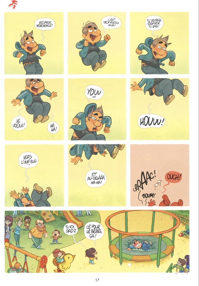 C’est vraiment le chaos dans la vie de Dad. Entre une chienne star, une aînée prête à voler de ses propres ailes, les deux du milieu qui s’affirment et la petite dernière qui commence à écrire, ça ne le rajeunit pas. En toute malignité et intelligence, Nob fait micro-évoluer sa série sans brusquer les lecteurs. En guest, l’auteur invite l’une de ses anciennes héroïnes qui nous manque : Mamette. Dad est plus que jamais une série de générations. Le bonhomme voit le temps qui passe. Poussé par la génération suivante qui avance en âge, il ne voit comme seule solution que de se réfugier dans les souvenirs des moments idylliques de quand les filles étaient petites. Qu’elles le veuillent ou non, il les y amène. Dad, c’est des sourires, des rires, mais aussi de l’émotion.