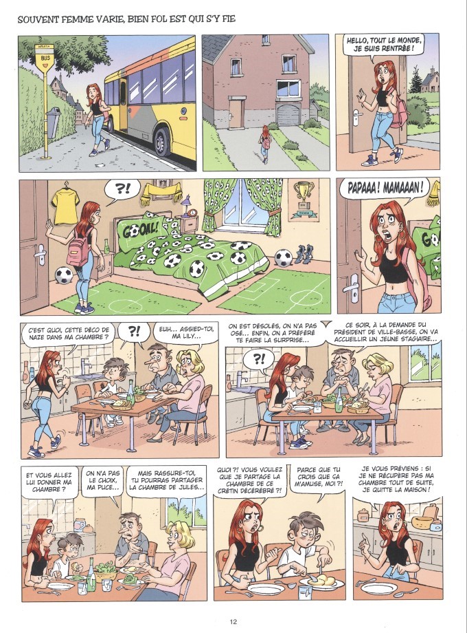 Si toute la famille Fontaine se rend au stade de foot encourager l’équipe de Ville-Basse, chacun n’a pas la même motivation. En particulier, Lily, 16 ans, est plus intéressée par le physique des joueurs que par l’esthétique du sport. Elle va faire rager ses copines en accompagnant le beau Roberto sur le terrain. Elle ne se doute pas qu’elle va pouvoir côtoyer un autre joueur d’encore plus près. Il s’appelle Baptiste et va être hébergé à la maison à la demande du président du Club qui vient de récupérer ce joueur pour l’équipe de Ville-Basse. Mais voilà que, suite à une entourloupe de dernière minute, Roberto signe un contrat pour Ville-Haute. Pour le père de Lily, plus possible de l’héberger. On ne va pas pactiser avec l’ennemi. Pour Lily, s’il ne vient plus à la maison, elle quitte le foyer. Comment les Fontaine vont-ils gérer cette crise ?