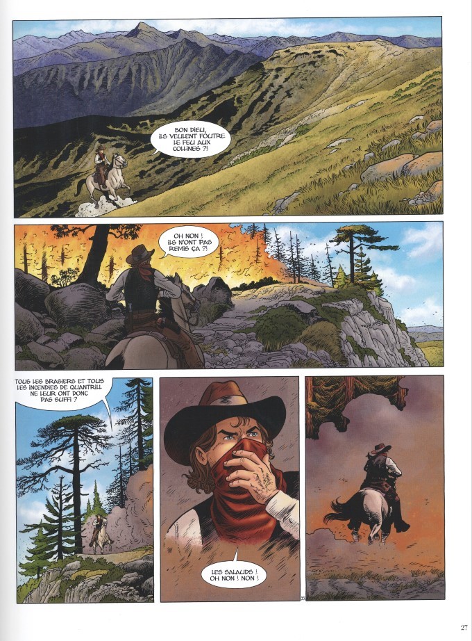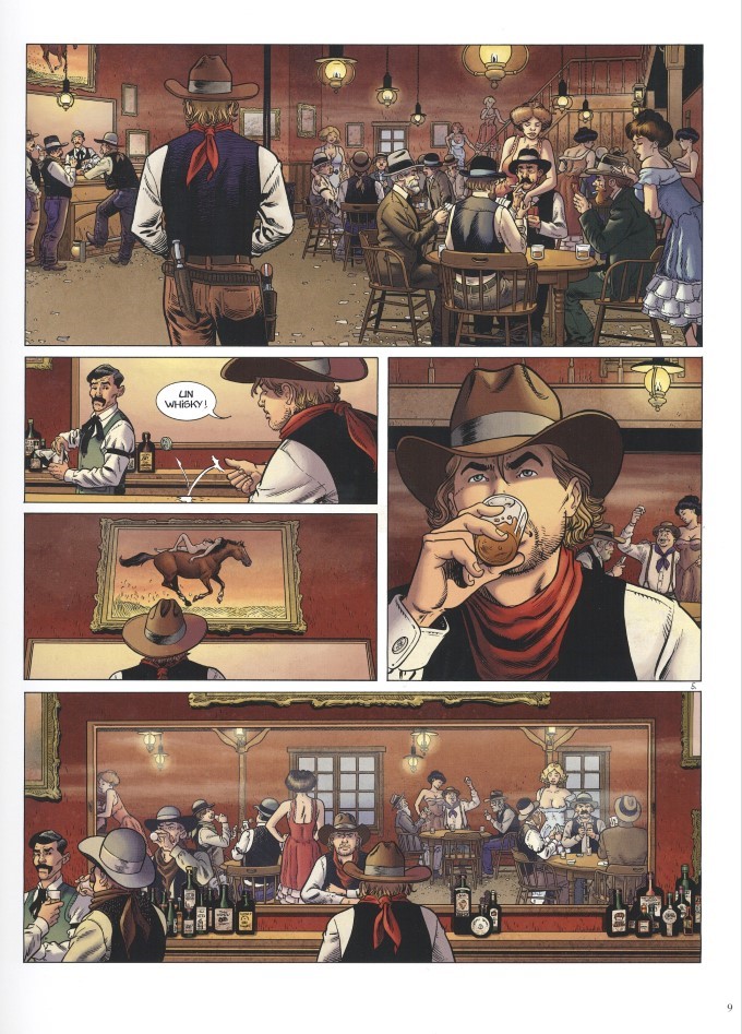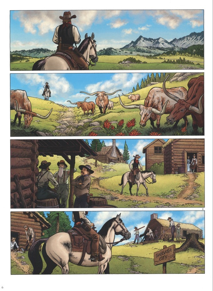 Après deux séries centrées sur l’aviation, Dent d’ours et Black Squaw, Alain Henriet se lance dans le western. Les vastes étendues survolées par les avions sont remplacées par les plaines et vallées franchies par les cow-boys. Le point commun est cette immensité qui s’étale à perte de vue. Henriet aime raconter des histoires qui respirent, et cela se ressent, dans ces décors parfois un peu trop propres. Ça, ce sont les restes de Golden Cup. Aux couleurs, Usagi donne de la dimension et, justement, un peu de cette crasse qui permet de mettre en valeur le trait du dessinateur.