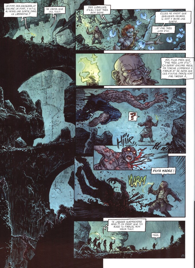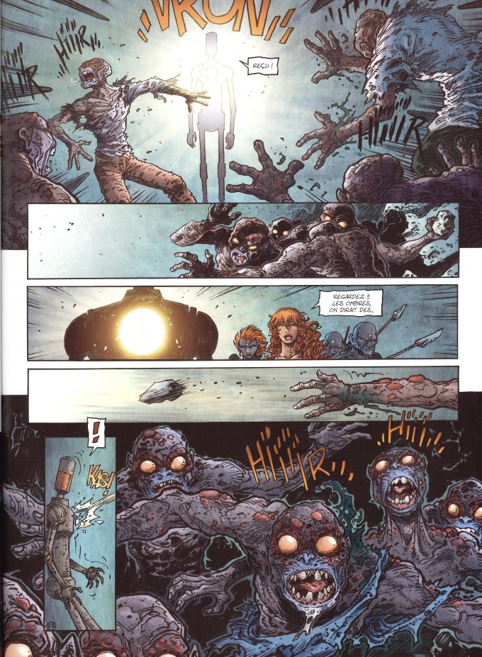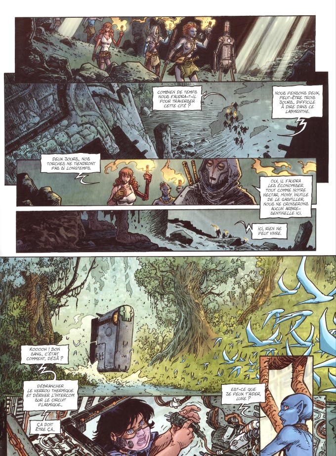 Alors que Mony Main-Rouge et sa troupe tentent de s’extraire d’un Walking Dead de tous les dangers, Lune et Shaël la jouent Panic Room. Lyse et Didier Tarquin mènent deux récits parallèles qui, on s’en doute, vont se rejoindre. En fin d’album ou dans le suivant ? Là est pour l’instant la question. Le suspens n’est pas haletant puisqu’un sticker « Fin du cycle des sables de Tishala » orne la couverture. Il y a toujours la problématique du qui sera du grand final, dans quel camp que ce soit. Les Tarquin s’éclatent et happent le lecteur dans cette saga de SF-Fantasy. Mony fait figure d’une Tomb Raider 3.0. Dans cet épisode, la forteresse permet d’explorer de nouveaux décors, sombres à souhait, tandis que la forêt luxuriante avartadise le début et la fin de l’album.