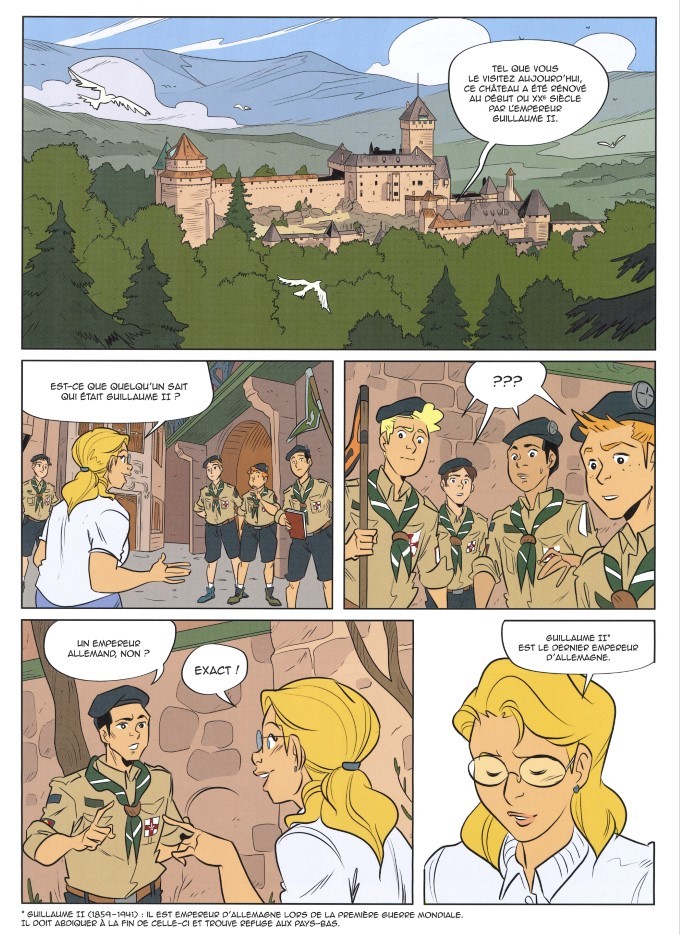 Charlie et ses camarades scouts de la patrouille du Faucon sont en visite au Haut-Koenigsbourg. Ce château d’Alsace a été rénové au début du XXème siècle par l’Empereur Guillaume II. Il a été le dernier empereur d’Allemagne avant d’abdiquer à la fin de la Première Guerre Mondiale. Si depuis 1918 la région est française, ça n’a pas toujours été le cas. Elle a navigué entre ce qui est aujourd’hui la France et l’Allemagne selon les époques. Il existe un château sur les lieux depuis au moins le XIIIème siècle. Laissé à l’abandon depuis 1633, Guillaume II organise sa restauration de 1901 à 1908. Il le rénove pour en faire un symbole de puissance. Aujourd’hui, les scouts admirent l’architecture et le décorum du monument.
