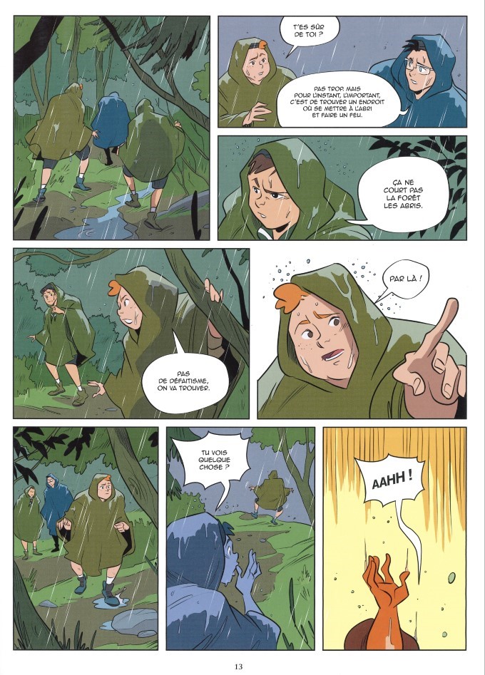 Après la visite, le chef de patrouille annonce le démarrage des raids. Chez les scouts, ils font partie de la progression. En fonction de l’ancienneté, un raid se réalise seul ou en groupe et peut durer de un à trois jours. Chaque groupe reçoit donc un carnet de raid, un téléphone à neuf touches à n’utiliser qu’en cas d’urgence, une carte, une boussole et des provisions pour 36 heures. Charlie, Augustin et Maxence partent ensemble. Très vite, il faut revêtir les ponchos car le temps se gâte. Maxence chute sur le sol humide et se blesse à la jambe. Il est dans l’impossibilité de marcher et, comble du comble, le téléphone de secours ne fonctionne pas. Charlie tente d’aller chercher de l’aide mais doit vite abandonner.