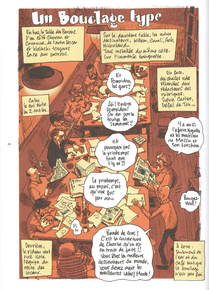 Au fil des ans, Daniel Fuchs emmène Joub et Nicoby, et tous les lecteurs avec, dans les coulisses du journal bête et méchant, et de son successeur Charlie Hebdo lorsque Hara-Kiri sera interdit de publication. On va rencontrer tous les participants à cette aventure éditoriale, avec en tête le Professeur Choron, qui créa le journal en 1960 avec Cavanna et Fred. Ils seront rejoints par Cabu, Gébé, Reiser, Topor, Wolinski, Pierre Fournier, Willem, Delfeil de Ton, pour ne citer que les plus célèbres. Tant de noms qui résonnent comme le souvenir d’une époque bénie où tout semblait permis. Tout ? Enfin presque, puisque les publications tomberont plusieurs fois sous les coups de la censure. Fuchs témoigne d’une époque libertaire et libertine définitivement révolue.