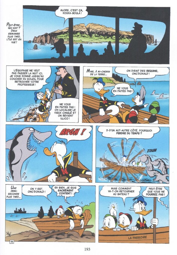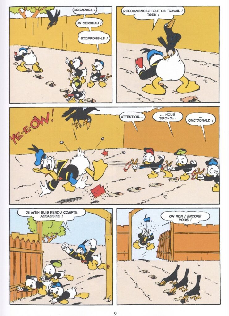 A tout seigneur tout honneur, plus de la moitié des aventures de l’album, soit sept, sont signées Carl Barks. Des couacs et des crôôôas ! est la toute première aventure de Donald que l’artiste dessina en 1943 sur un scénario original. Des corbeaux empêchent Donald de cultiver son jardin. L’histoire suivante emmène notre canard en pique-nique avec Daisy, avant qu’on ne le retrouve veilleur de nuit. Riri, Fifi et Loulou lui présentent après une baguette de sourcier. Donald entre sous un grand chapiteau de cirque pour une plus longue histoire avec, une fois n’est pas coutume, des humains. Même dimension pour Trick or treat, une mythique histoire d’Halloween. Retour au format dix planches pour la dernière comédie où l’on retrouve notre héros aux prises avec son irascible voisin Lagrogne. Les aventures présentées s’étalent de 1943 à 1964. On peut ainsi remarquer l’évolution graphique du maître.