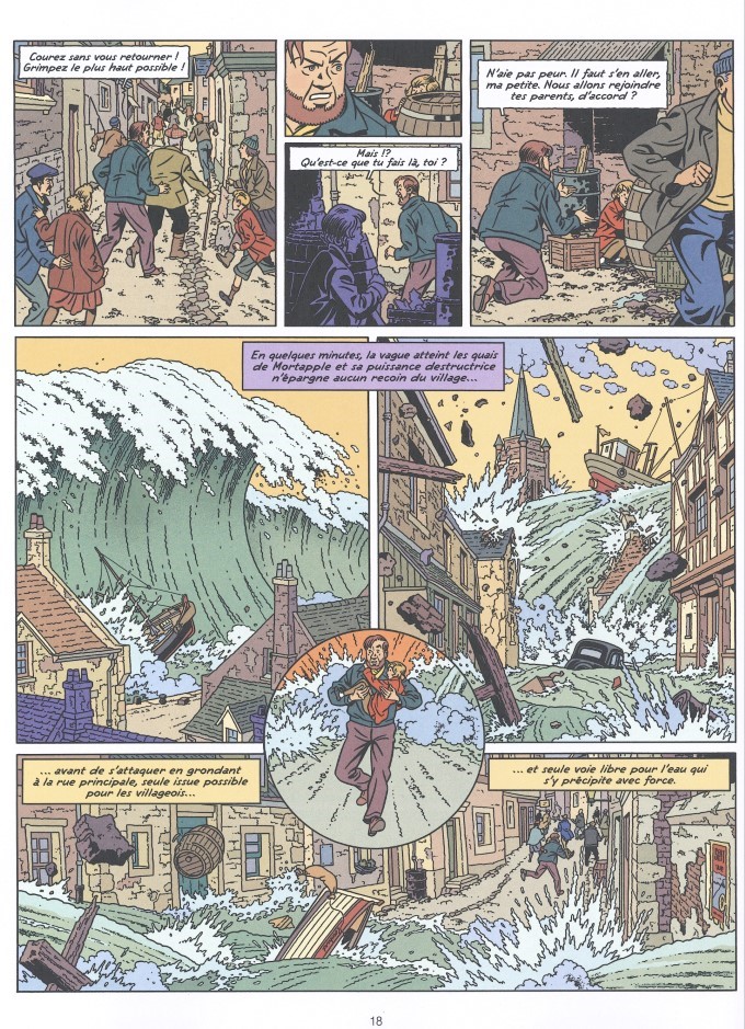 Au beau milieu de la mer du Nord, au large des côtes écossaises, un bateau de pêcheurs est découvert avec à son bord ses occupants morts sans aucune trace de sang ni de coups. Tout autour, flottent des cadavres de poissons. Alors que le petit village côtier de Mortapple est en émoi, un nouveau drame se trame au large. Un voilier de plaisanciers est victime de gaz mortels jaillissant des eaux. Au fil des jours, des événements semblables se produisent. Pendant que le Capitaine Francis Blake convoque une réunion de crise au MI5, le professeur Philip Mortimer, qui menait non loin de la côte des fouilles de terrain pour un rapport sur l’approvisionnement du pays en énergie, est aux premières loges de ces phénomènes inexpliqués. Quelques jours plus tard, Blake et Mortimer partent explorer les fonds marins et ce qu’ils vont découvrir va dépasser l’imaginable et leur rappeler des souvenirs. Avec La menace Atlante, Yves Sente et Peter Van Dongen offrent une suite puissante à L’énigme de l’Atlantide, aventure mythique, comme toutes celles écrites par Jacobs, du duo british.