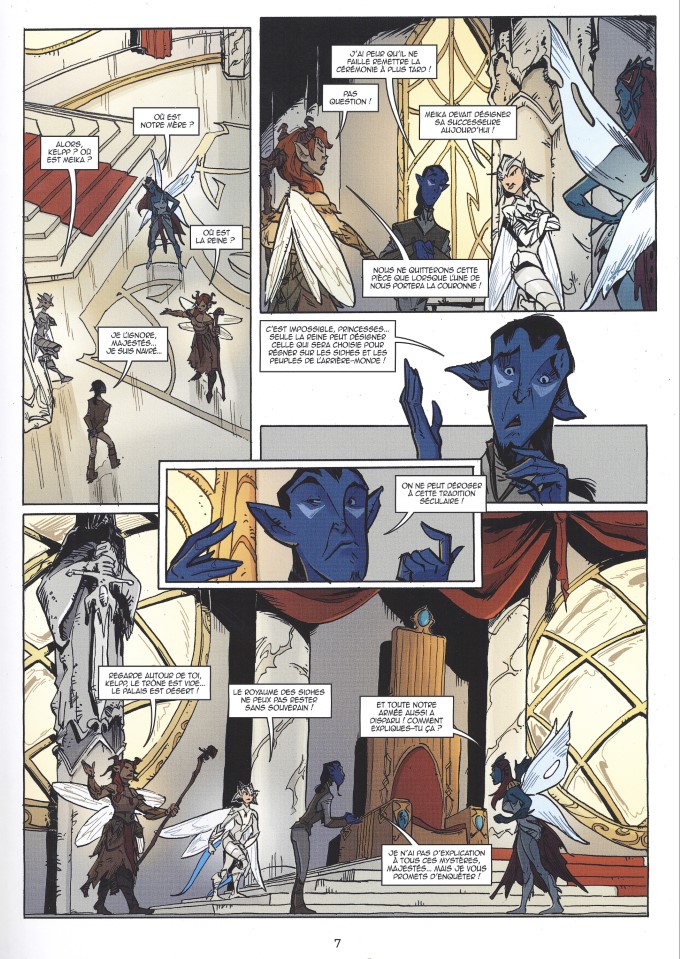 Entre complots, alliances et trahisons, le royaume des Sidhes est une partie de Risk grandeur nature dans un monde traditionnel d’Heroïc-Fantasy. Le démarrage de l’aventure est classique. Les poncifs du genre se retrouvent. Mais il ne faut pas oublier que le scénario est signé Corbeyran. Autant dire que l’on va rapidement quitter les sentiers battus. La partie va prendre une tournure politique qui n’est pas sans faire penser aux situations géopolitiques que l’on trouve dans plusieurs endroits du globe, le côté féérique en moins. Le dessinateur brésilien Paulo Borges, influencé par la mise en scène Comics, aime les grandes cases et les gros plans. Ça va très bien avec le propos. On n’est pas dans une Fantasy bourrin, mais bien dans une réflexion de stratégie territoriale. La couverture, même si elle est efficace, est trop dans l’esprit de celles des Elfes et autres Confrérie des tempêtes. Est-ce pour surfer sur la vague ? La référence n’était pas nécessaire d’autant plus que le trait de Borges est beaucoup plus souple et ligne claire que celui des auteurs habituels de ce genre de récits.