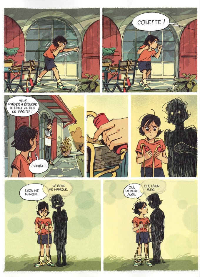 Colette a quatorze ans. Depuis qu’elle a perdu sa sœur jumelle Lison dans un accident de voiture, elle a cessé de grandir. Ses deux petits frères sont plus grands qu’elle. Sa passion, c’est la boxe, mais pour sa mère, il est hors de question qu’elle en fasse. C’est Elias qui a cafté quand il a eu peur pour son amie après un coup reçu. Lorsque ses coachs de boxe viennent dire bonjour à Colette dans son jardin pour savoir si elle reprenait ce sport cette année, ils se font rembarrer par sa mère. Pour elle, la boxe est un sport violent et dangereux. Elle ne voit pas l’apprentissage de la maîtrise de son corps et de sa force, le respect de soi-même et des autres. Pétrie de préjugés, elle pense protéger sa fille. Elle ne fait que l’enfoncer dans l’incompréhension et la tristesse. Paradoxalement, les frères peuvent pratiquer l’un le surf et l’autre le rugby sans problème. Heureusement, grâce à son père, Colette peut sortir de la prison superprotectrice de la maison et retourner au collège. Mais son temps libre, elle le passera à la maison.