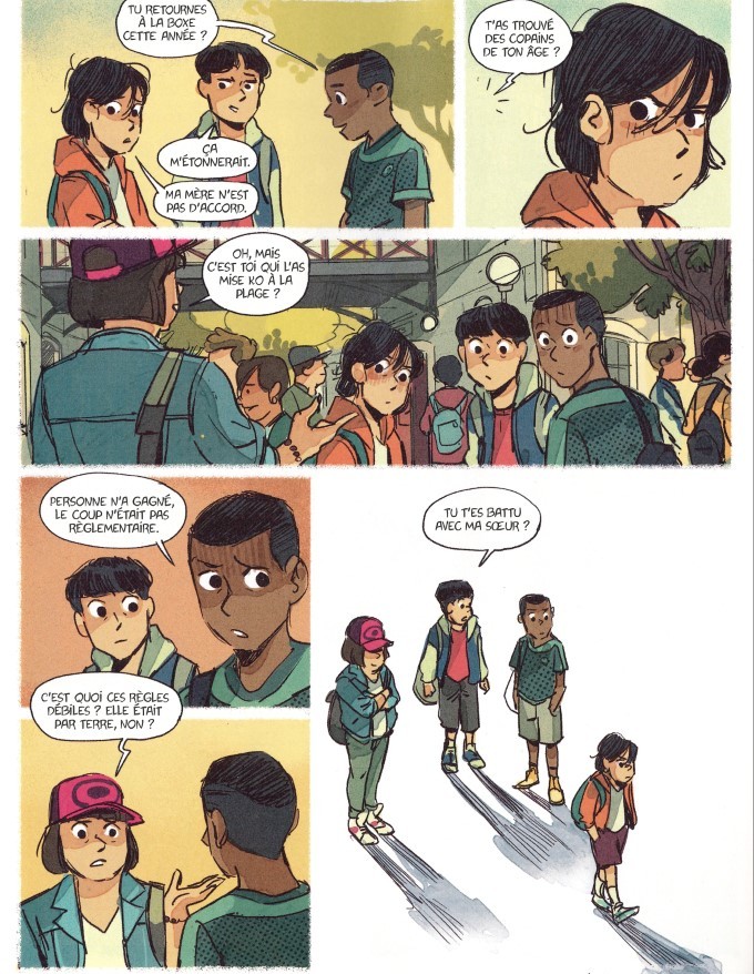 Colette est accompagnée d’une ombre plus grande qu’elle. C’est son moi à la taille qu’elle devrait avoir. La collégienne tente de vivre sa passion en cachette, mais sa mère la poursuit jusqu’à la salle d’entraînement. Comme il paraît impossible de pratiquer, le seul ring possible pour Colette va être la salle de gym du collège. Et si elle veut prendre sa revanche sur Marcus sans que sa mère ne le remarque, il va falloir éviter de prendre des coups. L’ombre la coache, l’encourage, l’incite à vivre sa passion. C’est aussi l’occasion pour Colette de montrer aux élèves qui la harcèlent pour sa petite taille qu’il y a quelqu’un de solide à l’intérieur de l’enveloppe. Alors que l’horizon semble obstrué et impénétrable hors temps scolaire, le bahut va-t-il permettre à Colette de montrer qui elle est ?