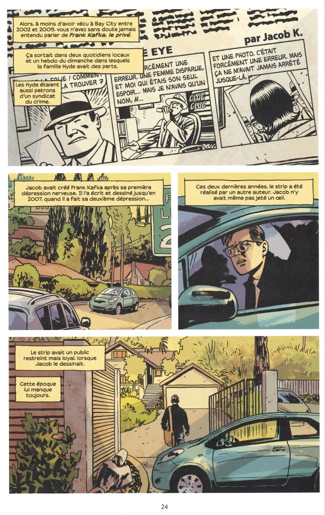 Mars 2012, Jacob Kurtz débarque à Hollywood. Après sa dépression nerveuse, une nouvelle carrière s’ouvre à lui. Le dessinateur de BD va voir son personnage fétiche le détective Frank Kafka adapté pour le petit écran. Méfiant, à l’aube de la quarantaine, Jacob n’a pas l’intention qu’il subisse le même sort que tous les autres dessinateurs et scénaristes passés par là avant lui. Il compte bien maîtriser l’avenir de son œuvre. La rencontre avec Dan Rails, le responsable, se passe plutôt bien. Il promet à Frank de lui passer dès le soir même les premiers scénarios. Dès la première lecture, c’est la douche froide. C’est mauvais, ça ne ressemble pas à son travail. Toute l’originalité de son personnage a disparu. Jacob est en train de découvrir la face cachée d’Hollywood. Réussira-t-il à faire passer ses idées ou sera-t-il contraint de s’effacer ? Il ne se rend pas encore compte du piège encore plus vicieux qui se referme sur lui.