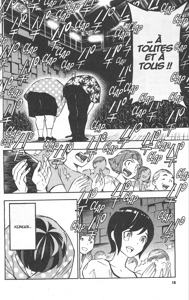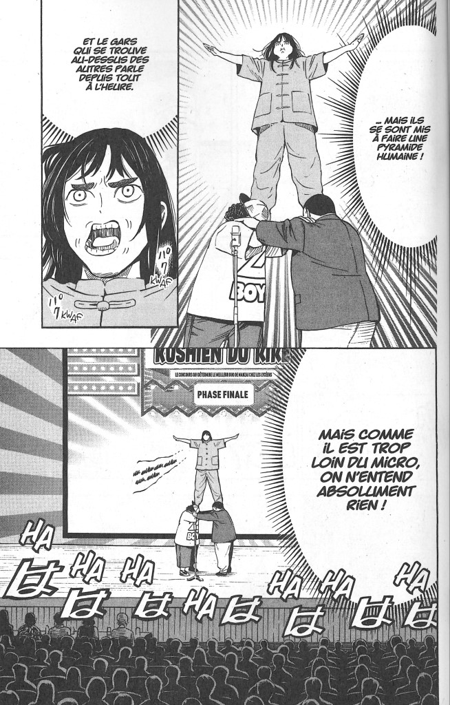 Le grand concours du Kôshien du rire est en plein déroulement. Pour l’instant, et depuis le début, le duo « Pantoufle de verre brisée » tient la barre en haut du panier. Le duo « Brutus » semble en bonne voie. Le public paraît conquis. Qu’en sera-t-il du jury ?… Suspens !… Aïe pour les uns, ouf pour les autres ! A deux points près, les filles de Pantoufle gardent leur place. Dépité par la défaite et fou de rage après le groupe « Punching-Ball bruyant », Ryûki demande à Azemichi de les venger en éclatant tout le monde à coups de rires. Dans tous les cas, avec Taiyô, Azemichi avait bien l’intention de tout donner. Mais pour l’instant, il y a d’autres groupes qui doivent passer avant eux.