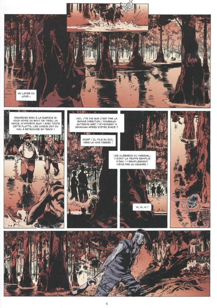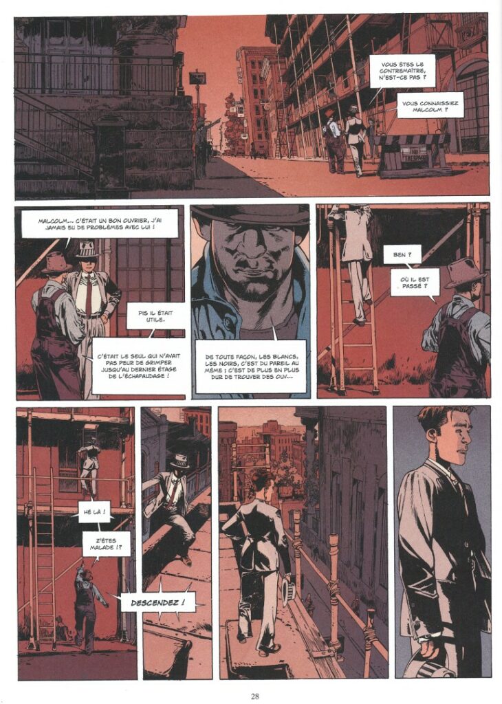 Philippe Pelaez propose un polar noir et réaliste qui a de grands échos avec la montée du fascisme dans de nombreux pays d’Europe et du monde. Cent ans avant aujourd’hui, la différence gêne, que ce soit une différence de couleur de peau ou une différence de mœurs. Alors que la colère du peuple ségrégationniste monte, l’agent David vit difficilement son homosexualité. Il ira jusqu’à renier l’amour pour son compagnon. Ne serait-ce pas en fait pour le protéger ? Tout comme Zacharie face à son employeur. L’enquête n’est qu’un prétexte pour sonder des âmes torturées, tortueuses, torturantes. Hugues Labiano multiplie les aplats pour accentuer la noirceur dans un graphisme réaliste rude. Jérôme Maffre tient un rôle de coloriste stratégique dans des tons de soleil couchant, quel que soit le moment de la journée, parce que dans un monde comme ça, le crépuscule ne se termine jamais. C’est dans ce genre de livres que l’on remarque qu’un coloriste est un auteur, au même titre que le scénariste et le dessinateur.