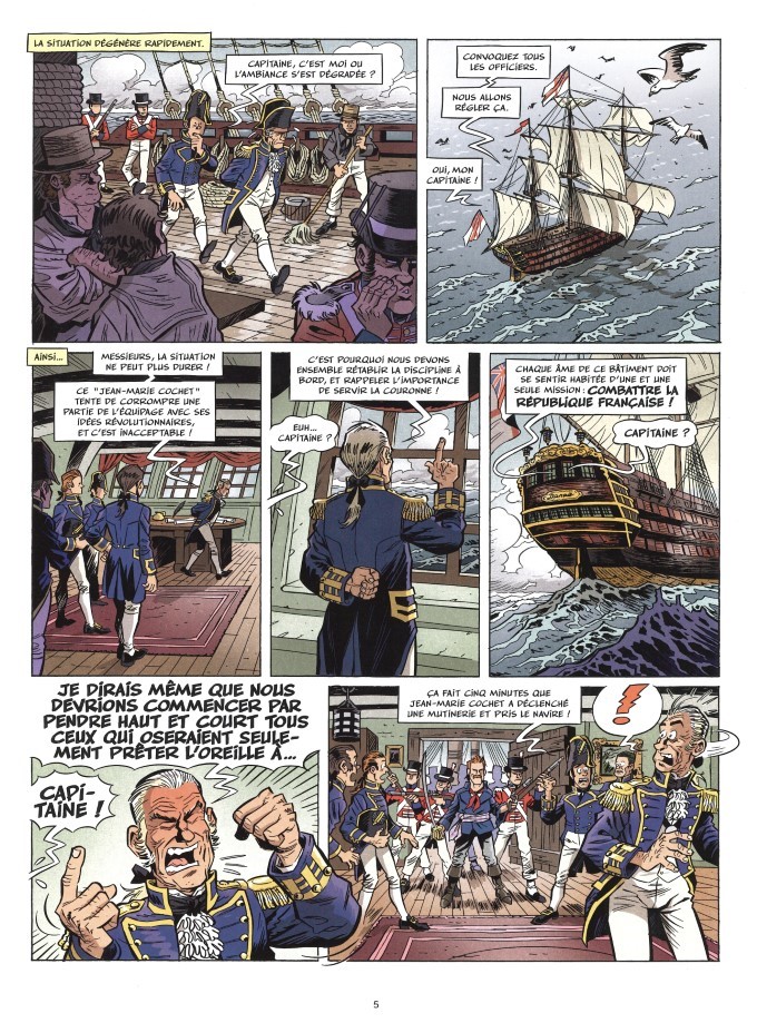 Mars 1800, au large d’Ouessant, le corsaire Jean-Marie Cochet est capturé par un navire anglais. Les britanniques ne se doutaient pas que le syndicaliste allait retourner le cerveau de l’équipage et déclencher une mutinerie. Se saisir de Napoléon lui-même aurait été moins dangereux. Quelques années plus tard, en 1806, on retrouve ce dernier sur le front prussien. Tout semble en bonne voie mais l’ennemi prépare une contre-attaque. Entre les différents angles d’assaut, qui aura le plus fait plier l’ennemi ? Bernadotte va en tous cas briller par sa lâcheté. C’est le roi des sales coups. Autre sale coup mais coup de folie que celui de Claude-François de Malet qui va faire croire que Napoléon est mort en Russie. Quand on pense que s’il avait réussi, ce dernier aurait peut-être gouverné la France… « La France gouvernée par des fous qui nomment Ministre n’importe qui, Impossible, vous dites ? Ne dites pas ça, soldat. J’ai l’impression que vous allez nous porter la poisse. » s’exclame Napoléon.