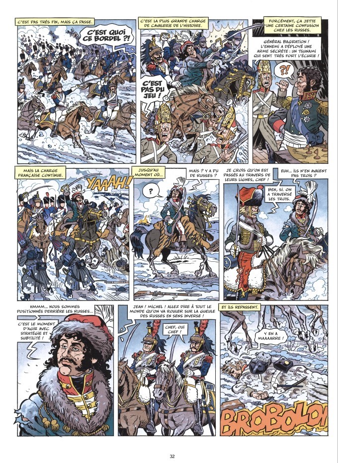 Au milieu de ces histoires toutes véridiques (c’est le principe de la collection), le scénariste historien Julien Hervieux glisse des anecdotes cocasses. Masséna invente la dérobade sur popotin pour descendre une pente impraticable. Daumesnil montre son cul pour récupérer des boulets. Le petit tambour d’Arcole met tout seul en déroute les troupes autrichiennes. Napoléon organise un trafic de faux-billets en roubles. On découvre d’où vient l’expression avoir les dents du bonheur. Et c’est justifié. Vincent Malgras fait le stroyboard qui sert de base au dessin de Camille Prieur, dans un réalisme qui laisse place à la comédie, mettant ainsi l’accent sur l’incongruité de certaines situations.