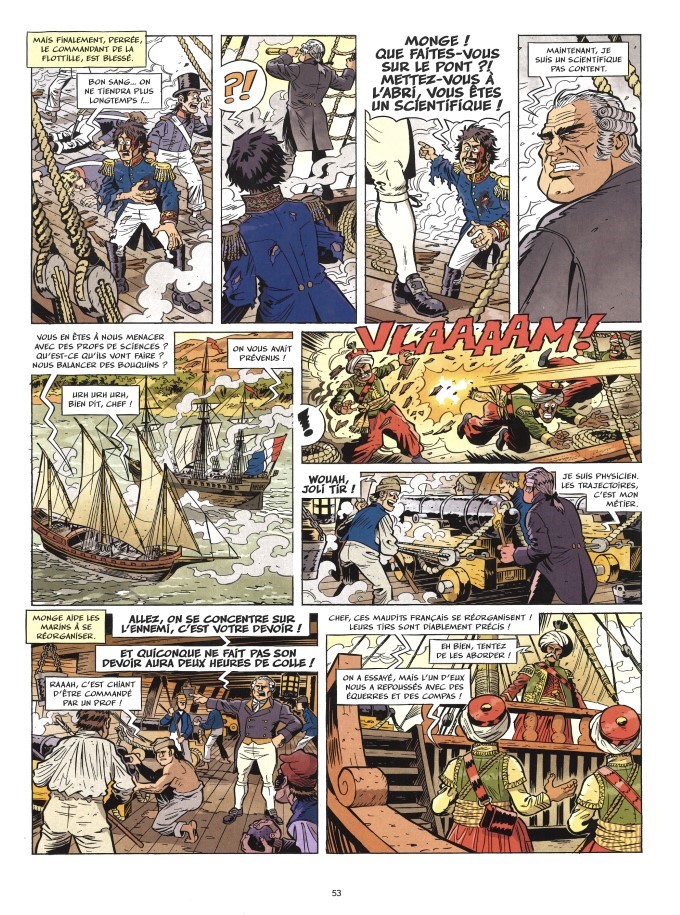 Les hussards font un petit tour en Espagne en 1809, pour sécuriser les routes farcies de bandits. Les troupes anglaises du général Wellington venues envahir le pays ne réalisent pas à qui ils vont se frotter. Retour en Prusse en 1807 pour un affrontement incroyable avec une charge de 12000 cavaliers dirigés par Murat, avant de revenir en Espagne où Agustina de Aragon fait figure de Jeanne d’Arc locale combattant les français. Histoire de rocher au large de la Martinique. Les anglais s’en emparent en 1804 et en font…un navire de guerre ! Et on termine par le départ de Gaspard Monge, scientifique et ancien ministre, partant en expédition en Egypte et qui aime bien la baston.