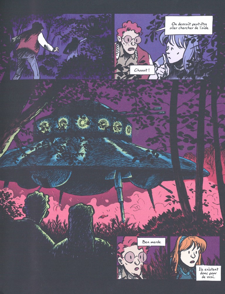 S’il y a bien un scénariste qui surprend et se remet en question d’album en album, c’est bien Xavier Bétaucourt. Il a traité un faits divers sociétal avec Ils ont tué Léo Frank. Il a donné une autre vision des patients en hôpitaux psychiatriques avec Les âmes fendues. Aujourd’hui, il raille le complotisme américain dans une comédie dramatique de la veine de Mars attacks ! Opération Moon Fire revisite l’invasion extra-terrestre en menant sur de fausses pistes. Il prend le lecteur à contre-sens, le mettant face à ses responsabilités quant aux faux-semblants. Sous les couleurs pulp de Paul Bona, Olivier Perret clarifie son trait et s’éclate dans des scènes totalement foutraques. Seul le visage photographique de Kennedy témoigne d’un ancrage historique.