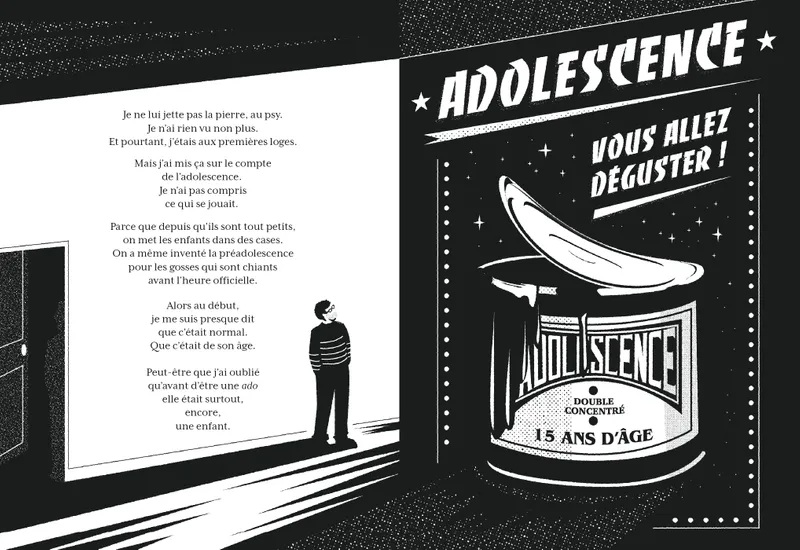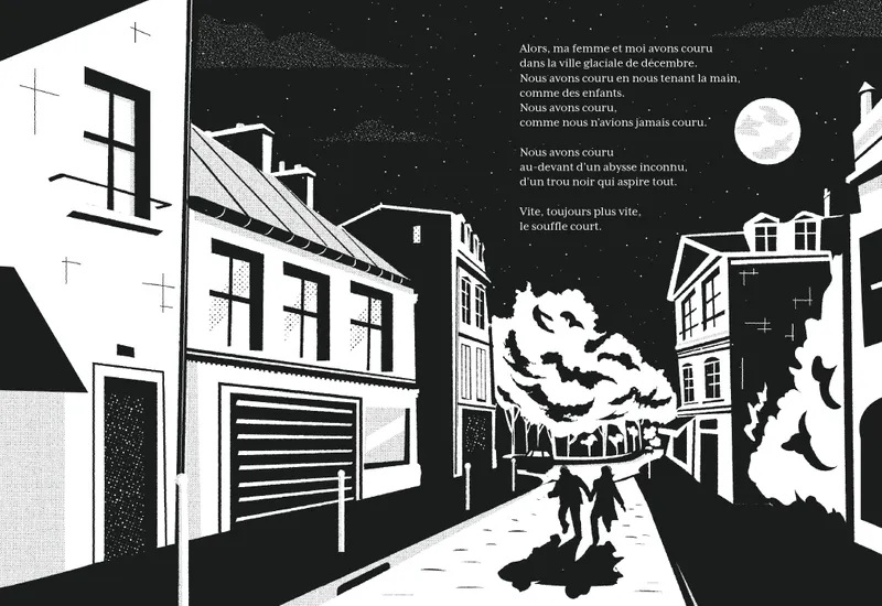 Un mot quand même sur les illustrations. Mathieu Persan est un graphiste. Il joue avec les textes et les textures dans des dessins en noir et blanc percutants. Les personnages n’ont pas de visage parce que, même si c’est son histoire, ils sont tout le monde. Le passage est une histoire à la mise en scène immersive.