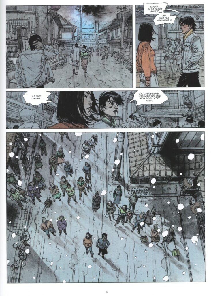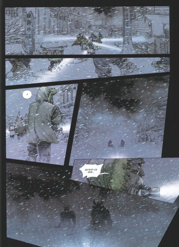« Je tuerai la pianiste afin que l’on sache que quelque chose existe. » Ces quelques mots écrits par Gérard Manset pour une chanson d’Alain Bashung introduisent l’album. A sa sortie, le chanteur déclarait ceci : «C’est presque une phrase ambiguë pour moi. «Je tuerai», je n’ai jamais formulé cela aussi directement, même si la pensée nous effleure tous un jour. En règle générale, j’ai toujours veillé à ne jamais dire ou chanter quelque chose qui aurait à voir avec la compassion. Je déteste faire l’artiste qui se plaint. Mais là, on est un peu dans le Fantôme de l’opéra, avec un personnage fou d’amour, une grande souffrance tragique. Alors, pourquoi ne pas dire que chez les artistes aussi les choses ne sont pas toujours très claires.» Un personnage fou d’amour, une grande souffrance tragique, on est peut-être dans la tragédie de Gaston Leroux, mais on est aussi dans Neige de sang. Alain Bashung ne le savait pas, mais il chantait Neige de sang. Je tuerai… Quelque chose existe… Comme le disait l’interprète, chez les artistes, les choses ne sont pas toujours très claires. Les artistes Corbeyran et Rurik Sallé installent leurs personnages dans une quatrième dimension mystérieuses, mais tout sera justifié. Aux dessins et aux couleurs, le prolifique Jef montre plus que jamais qu’il est l’une des valeurs sûres du moment. Jef prend des risques, se remettant en question d’une planche à l’autre avec des découpages pas toujours conventionnels, même dans des scènes qui pourraient sembler plus calmes que d’autres.