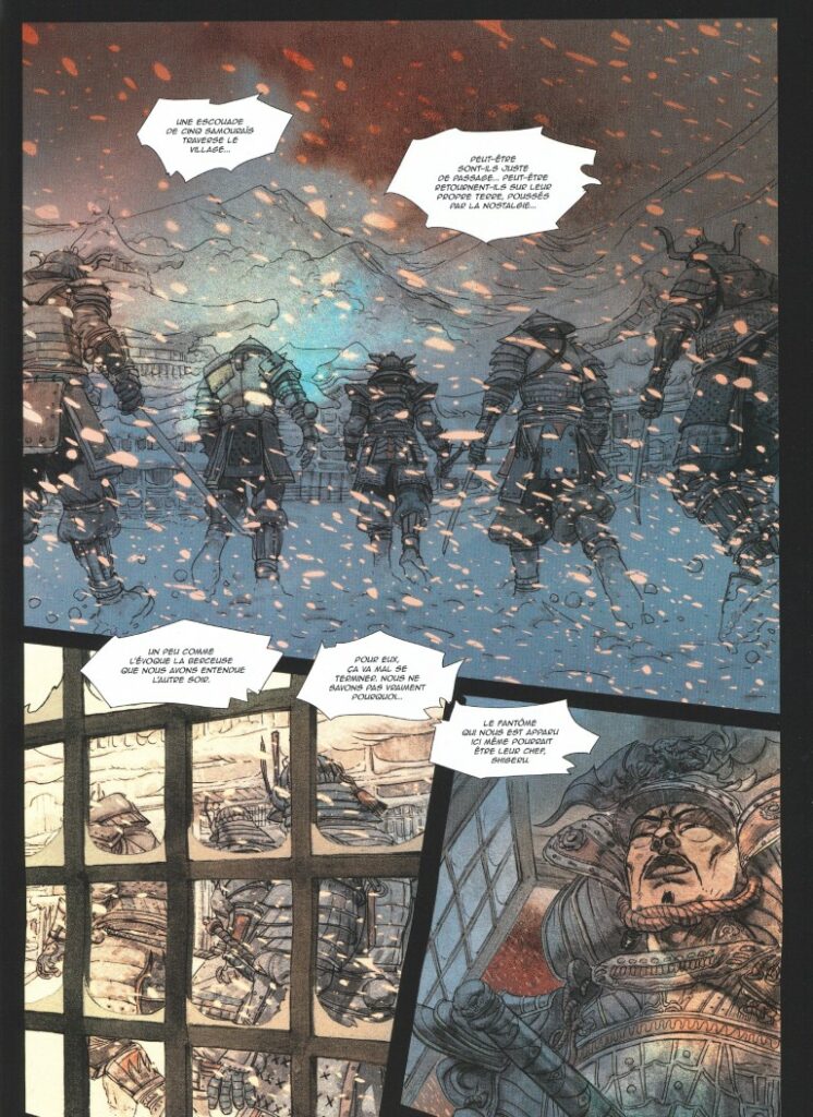 De la neige en plein été, ça n’a rien de normal. Il fait de plus en plus froid. Makiko propose à ceux qui le veulent de passer la nuit dans l’auberge, le temps que la tempête se calme. Au quatrième jour, un cadavre lacéré est découvert dans le blizzard. Quelqu’un aurait-il profité des conditions pour commettre un crime ? Le lendemain, c’est une deuxième victime qui gît sur la place du village. Un assassin rôde dans les rues. Alors que les reclus commencent à se regarder en chiens de faïence, Takashi et quelques volontaires décident de sortir faire une ronde. L’ombre mystérieuse qu’ils aperçoivent va entrer dans le bar à minuit trente. C’est un étrange samouraï qui repart sans toucher au verre qui lui a été proposé, après avoir fredonné une berceuse traditionnelle. Une légende raconte qu’autrefois cinq samouraïs se seraient installés dans la seule auberge du village, ici même. Que sont-ils devenus ? Le visiteur du soir en fait-il partie ? Quel est leur lien avec les meurtres perpétrés ?