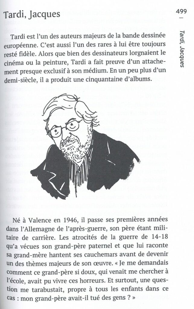 Côté auteurs, les ténors sont évidemment au rendez-vous : Jacobs, Martin, Uderzo, Morris, Franquin, Goscinny, Moebius, Tardi, Gotlib… Jijé passe au second plan, dans les articles sur Franquin et le journal Spirou. Saint-Ogan entre par l’intermédiaire de Zig et Puce. Quinze pages sont consacrées à Hergé. Le maître n’en méritait pas moins. L’entrée du dictionnaire est composée de deux parties très distinctes. Si la seconde raconte Hergé, la première raconte les rapports qu’ont entretenus les deux hommes. Tintin au Tibet est la première BD qu’a lu Peeters. Plus tard, il réalisera un travail universitaire sur Les bijoux de la Castafiore, avant de le rencontrer pour un entretien destiné à la revue littéraire Minuit. Peeters publiera une biographie de Hergé en 2002.