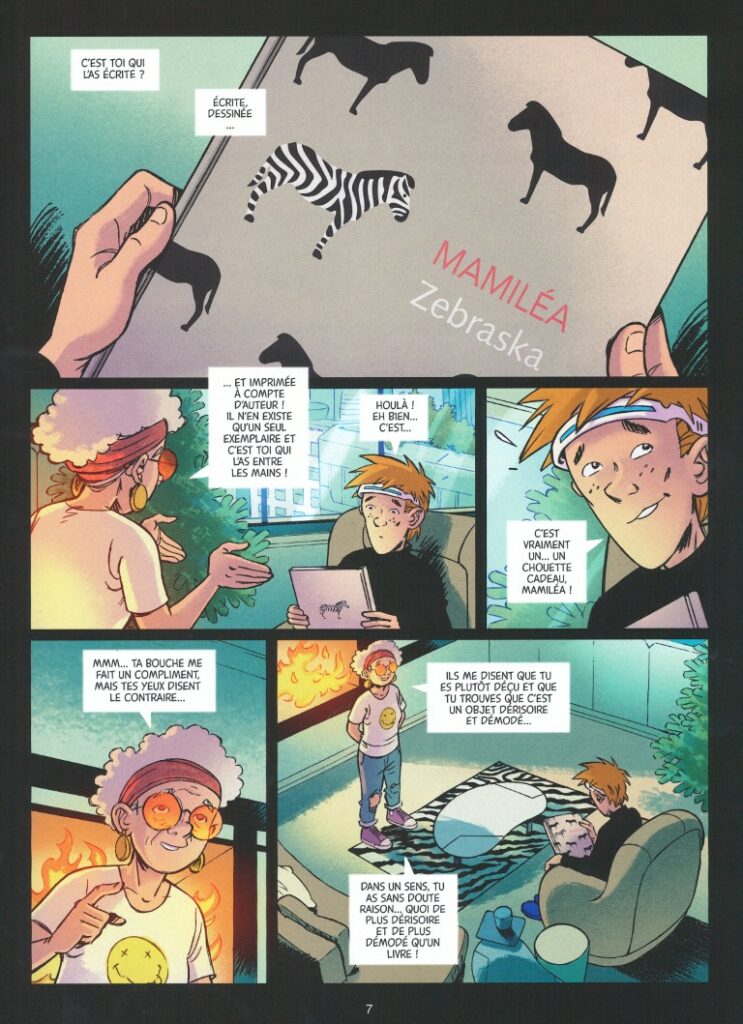 Corbeyran et Isabelle Bary adaptent le roman de cette dernière dans un diptyque dont voici la première partie. C’est l’histoire d’un enfant à haut potentiel, un enfant « zèbre » comme on les appelle, précoce, surdoué, avec des capacités hors normes et une hypersensibilité exacerbée. En fin d’album, un dossier explique parfaitement leur problématique. Le récit navigue entre un présent, qui est le futur pour le lecteur, et un passé, présent du lecteur. Des intercases noires ou blanches différencient les époques. Les scénaristes les alternent au fur et à mesure de la lecture de l’album par Marty, complexe et questionnante pour lui. Outre une histoire de Haut Potentiel, le livre aborde aussi la préoccupation de la lecture dans le futur, de plus en plus en lutte face aux écrans. « Lire est une conquête, Marty. Un acte d’insolence. Un récit ne tolère aucune simplification. Aucune évidence. Oublie tes lunettes 3D, mets tes sens aux aguets. » Ces mots que prononce Mamilia pourraient très bien être dits par Corbeyran lui-même aux lecteurs. On reconnaît en eux le point de vue du scénariste hors pair aux plus de 460 albums.