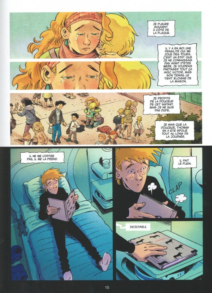 Pour illustrer l’histoire, on retrouve Ludo Borecki, le dessinateur au réalisme souple de La vie compliquée de Léa Olivier. Il apporte une douceur certaine et une émotion remarquable dans les regards des personnages, en particulier chez la maman de Thomas.