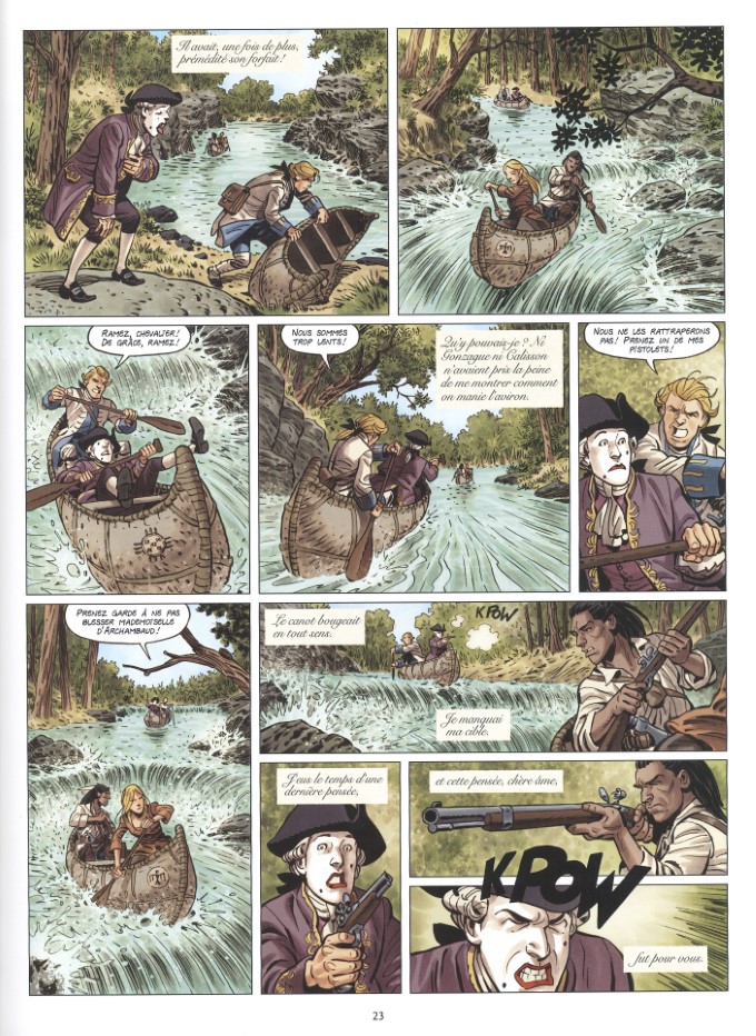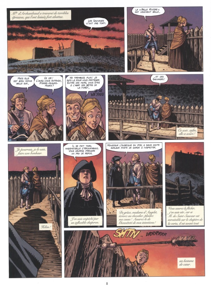 Les choses se compliquent pour les colons français. Dans cette ambiance déjà fin de règne pour eux, le chevalier de Saint-Sauveur est bien plus préoccupé par ses amours et sa survie que par la conquête de territoires. Dans ce cycle qui se clôt, certains acteurs rentreront en France tandis que d’autres resteront faire leur vie, ou leur mort, dans le Nouveau Monde. Un cycle se clôt, mais un autre s’ouvre aussitôt puisque le scénariste épistolaire Alain Ayroles met en place un cliffhanger augurant de nouvelles liaisons dangereuses. Au dessin et aux couleurs, Richard Guérineau navigue de somptueux paysages à de dramatiques scènes de guerre, de scènes d’amour en tractations politiques, chaque fois avec la même minutie.