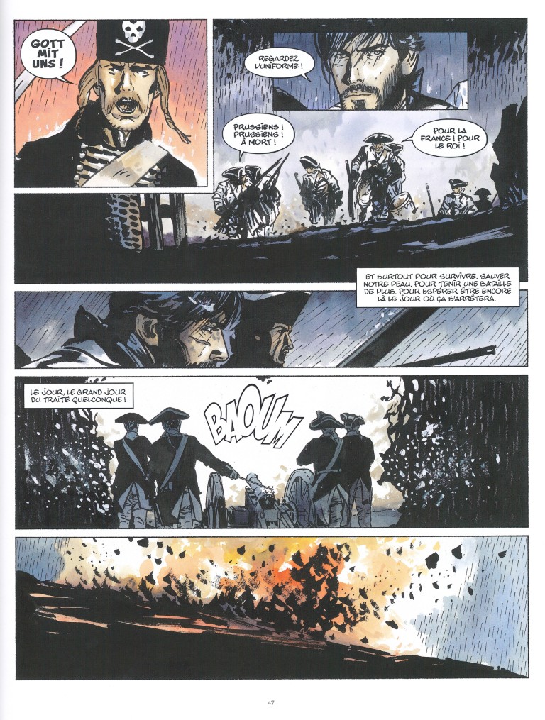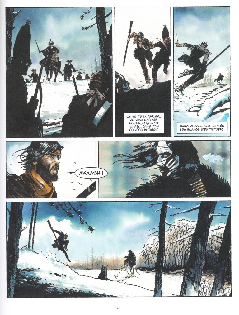 Malgré le souhait de sa défunte épouse, ce n’est pas demain la veille que notre français restera avec son fils. Avant de retourner faire la guerre sur le vieux continent, il le récupère pour l’emmener en sécurité dans la tribu de sa mère. Le cœur serré, il n’a pas la force de le prendre une dernière fois dans ses bras, mais il lui jure qu’ils se reverront. Après quelques années dans la boue et le sang face aux troupes prussiennes, démobilisé suite à ses blessures, Pierre Larchange fait son retour en Amérique, en Nouvelle France. Là-bas, la tension ne s’est pas apaisée. Dans le camp anglais, après la mort de son père, c’est une femme, Jane Moran, qui met à mal les troupes françaises. Akaash a repris sa liberté. Et le fils de Pierre a disparu.