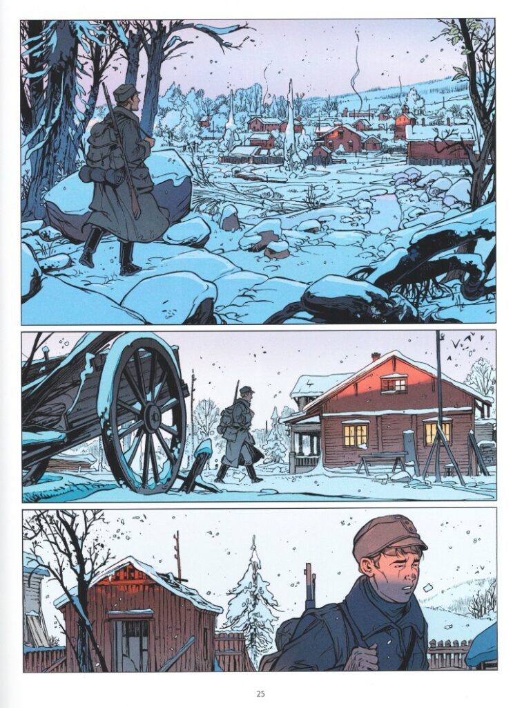 Le scénariste Kid Toussaint ne se prétend pas biographe. Il utilise intelligemment des événements véridiques pour en tirer l’essence d’un drame humain. Alexandre Dumas disait : « L’histoire est un roman qui a été ; le roman est de l’histoire telle qu’elle aurait pu être. » Kid applique la technique sur un événement méconnu chez nous, parce qu’il ne fait pas partie de l’Histoire de France, mais qui est pourtant un écho des conflits contemporains. Avant d’être un sniper, Riku est une victime des chefs de guerre, embourbé dans une spirale dont il lui est impossible de voir la fin. Iñaki Holgado fait passer toute la peur, la haine et la violence du tireur dans ses yeux. Le nombre des morts intégré aux décors est glaçant. La double page de la tranchée et de l’attaque aérienne emprisonne les lecteurs dans le conflit. Les couleurs de Raphaël Bauduin et Anaïs Blanchard montrent aussi bien la boue et le sang que la blancheur dramatique de la neige qui va être tachée.