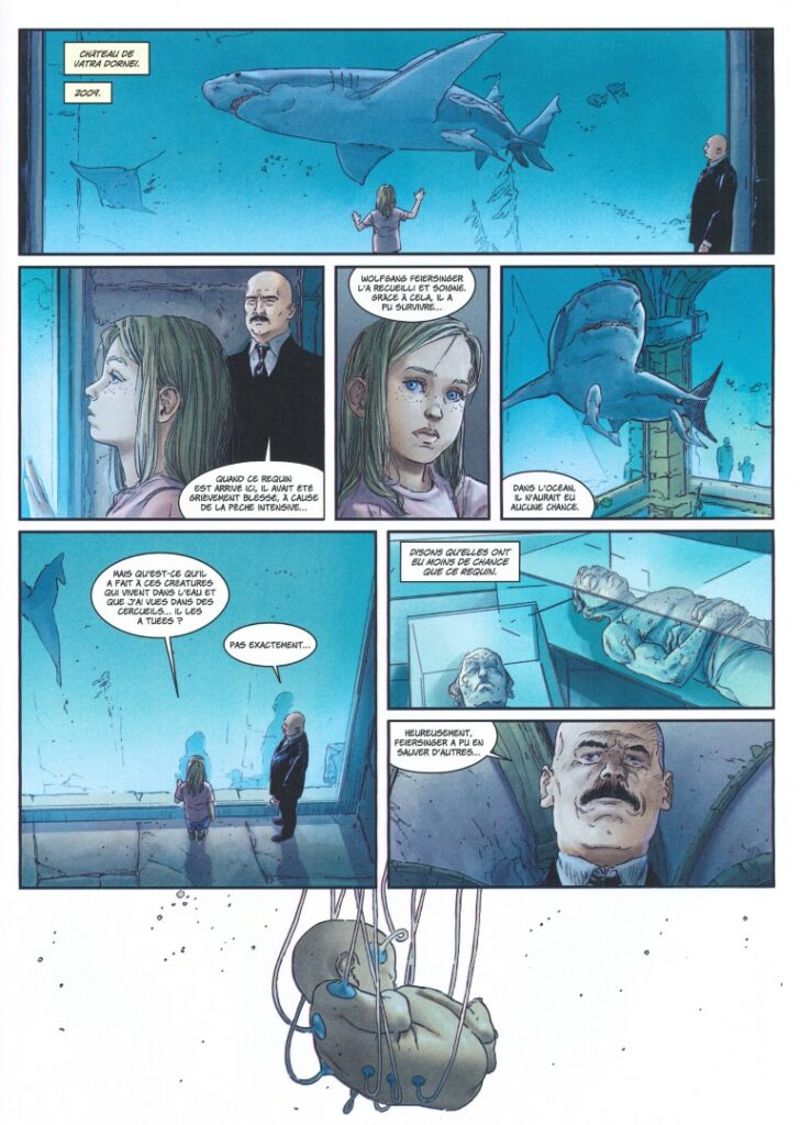 2009, dans les sous-sols du Nid d’aigle de Vatra Dornei dans les Carpates, la petite Lou fait une découverte étrange. Dans des box entassés les uns sur les autres, il y a des hommes-poissons, avec des branchies, comme elle. C’est certain, c’est Monsieur Feiersinger, alias le centenaire des Carpates, qui a fait ça. Elle le déteste et décide de fuguer dans la forêt en pleine nuit. Ce ne sont pas les loups qui vont l’impressionner le plus, mais une effrayante créature ailée qui lui passe au-dessus de la tête. Ça ne peut être qu’un Zmeu. Il ne faut pas qu’elle traîne là.