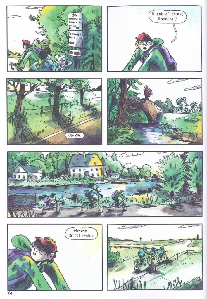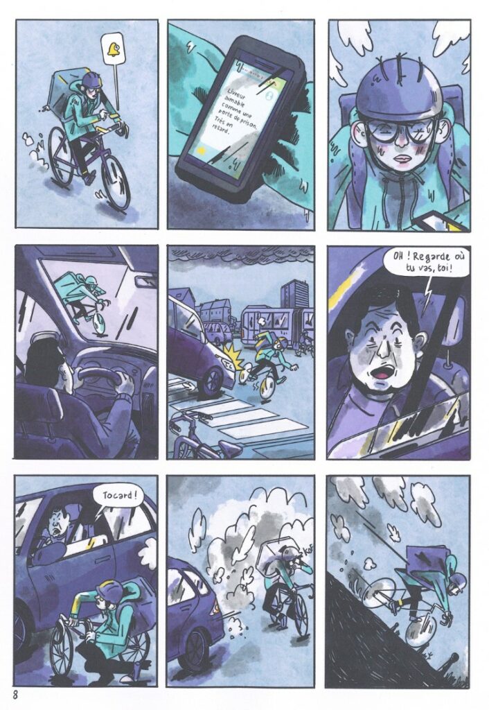 En 2018 déjà, Monsieur Iou avait frappé fort avec son Tour de Belgique, plusieurs fois réédité chez le même éditeur, Rue de l’échiquier. Dans un style graphique complètement différent, l’album racontait un road trip à vélo en Belgique dans lequel l’auteur-cycliste ne cherchait nullement la performance et privilégiait les paysages, les rencontres, l’humain. Les rencontres et l’humain, voici aussi l’âme de L’invisible, one shot dont on comprend le but au fur et à mesure de l’avancée de la lecture. Début banal, l’histoire d’un livreur lambda, sa morne vie de famille. Ça ferait un bon film des frères Dardenne. Puis, à l’aulne de rencontres improbables, non pas tout d’un coup comme le ferait une boule de bowling dans un strike mais plutôt comme dans un pendule de Newton, bibelot avec plusieurs boules et quand on bouge la première, ça bouge la dernière sans bouger celles du milieu, on réalise l’intensité de l’aventure dans laquelle on est embarqué.