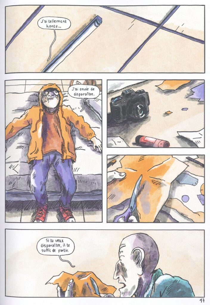 L’invisible est de ces albums qui touchent au plus profond du cœur. L’invisible, c’est l’histoire de trois paumés. Mais au fond, ne seraient-ce pas toutes les autres personnes qui gravitent autour qui seraient les paumés ? Ces trois-là, et bien ce sont eux qui ont tout compris au sens de la vie. Où commence et où s’arrête la liberté individuelle ? Que signifie vivre ensemble ? Si Kim est le personnage auquel le lecteur s’identifiera le plus aisément, Gustave est inspiré d’un artiste allemand qui a réellement existé : Gustav Mesmer, alias l’Icare de Lautertal, figure de l’art brut, doux rêveur obnubilé par les bicyclettes volantes.