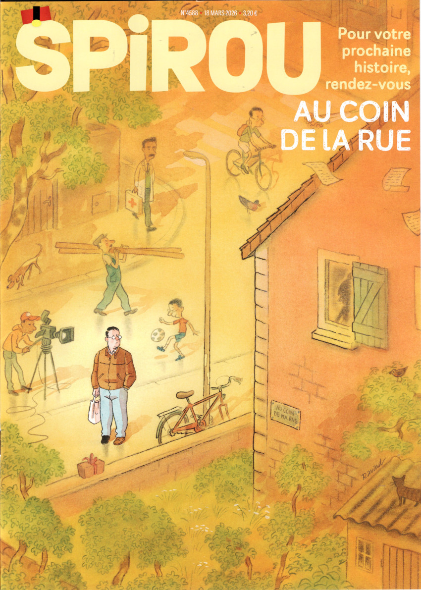 A l’origine, Au coin de ma rue est un spectacle de théâtre de rue signé Vincent Zabus et Nicolas Turon. A présent, Au coin de ma rue est une collection d’histoires courtes, chacune dessinée par un auteur différent, mais reposant toutes sur le même story-board muet. Une seule mise en scène, mais plusieurs récits, drôles, dramatiques ou étranges. C’est Jean-Louis Tripp qui a dessiné le story-board qui a servi de base à l’aventure de cet homme mystérieux devant sa maison. L’exercice est digne de l’Oubapo, ouvroir de bande dessinée potentiel, initié par L’Association, en écho à l’Oulipo, ouvroir de littérature potentielle, fondé en 1960 par le mathématicien François Le Lionnais et l’écrivain Raymond Queneau. Si Etienne Lécroart est le maître du genre en BD, Georges Pérec a donné ses lettres de noblesse au jeu avec La disparition, court roman écrit sans la lettre « e ». Au coin de ma rue entre avec panache dans le grand manuel de ces exercices de style. Les trois premières histoires se trouvent dans le magazine de cette semaine.