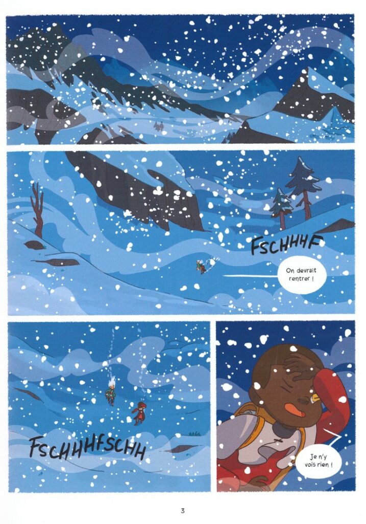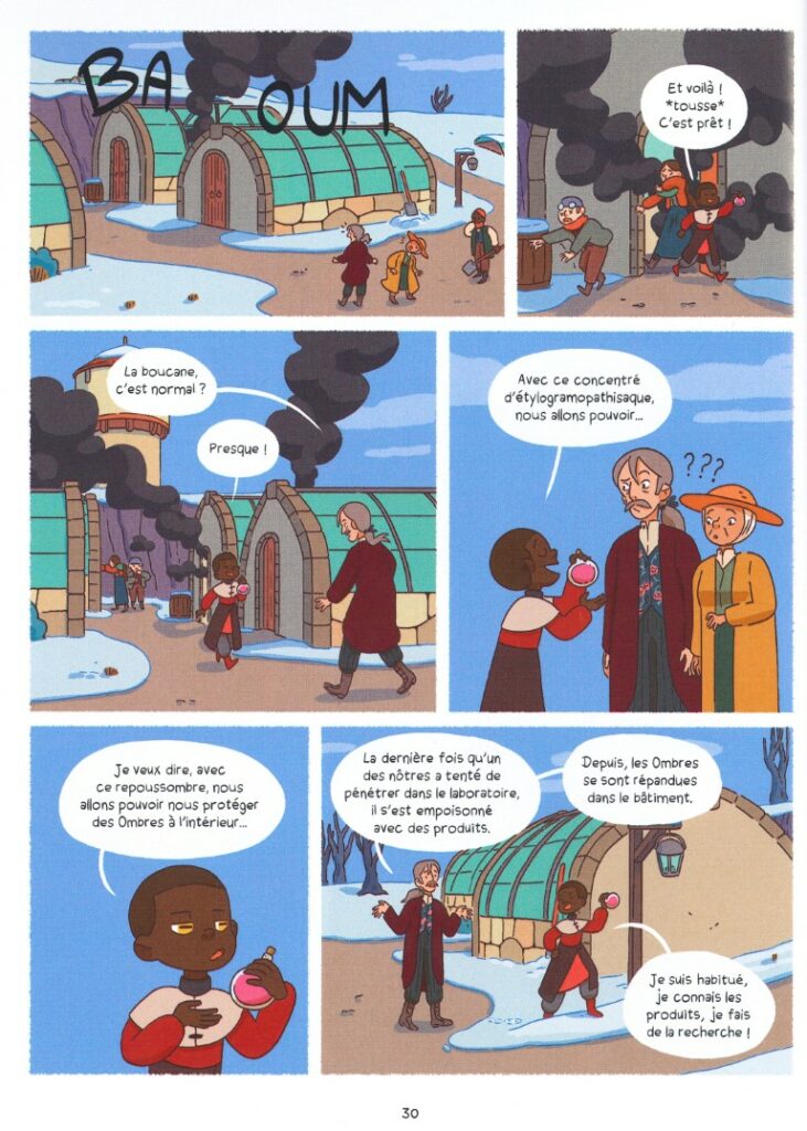 Le lendemain, la tempête a cessé. Reprenant leur route, ils arrivent au bord d’un océan de glace. Au loin, de la fumée ! Une île, un village et très certainement le lieu qui abrite le laboratoire. Une traversée périlleuse dans une embarcation de fortune … qui finit par prendre eau de toutes parts jetant nos amis dans l’eau glacée. Heureusement, la côte est proche et c’est en naufragés qu’ils échouent sur la plage. Les habitants du village les recueillent avec énormément de méfiance. En effet, ils viennent du Nord et …« Ce qui vient du Nord amène la mort ! » Il s’agira de les convaincre et d’obtenir leur aide pour pénétrer dans le Laboratoire … car ce dernier est bien là, mais abandonné et cloîtré depuis des années. Le remède s’y trouve-t-il ? « On a trouvé un message d’une prêtresse. Il disait de la rejoindre dans son laboratoire. Et maintenant, on cherche un remède pour ne pas tous rejoindre l’Ancien Peuple dans les Ombres. »