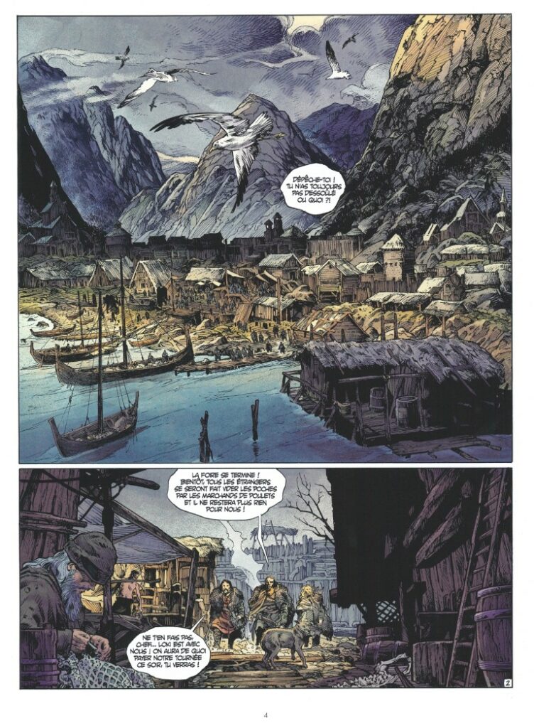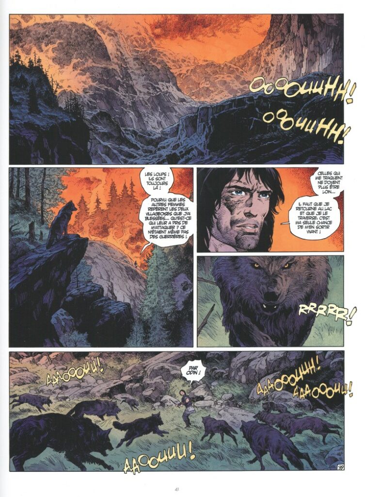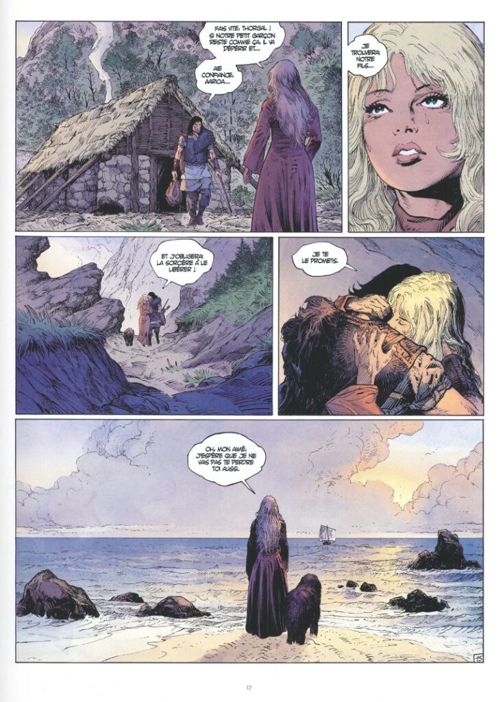 Christophe Bec reprend ses crayons en adaptant légèrement son style pour se rapprocher de celui de Rosinski. Il a raccourci ses hachures, adopté les bulles en nuages. Il parvient à maîtriser les personnages iconiques tout au long de l’album. On sait que la tâche est extrêmement complexe, qu’il ne faut pas décevoir les lecteurs, qu’il est inutile de tenter de copier-coller le maître, qu’il faut faire son propre Thorgal, avec sa propre personnalité tout en faisant croire au subconscient du public qu’il lit celui qu’il a toujours lu. De la mer déchaînée aux montagnes embrasées, du village côtier au palais de la divinité, Bec montre ses grands talents de décoriste, transcendés dans des doubles planches de toute beauté, donnant toute la dimension éditoriale que l’on attend d’une série comme Thorgal Saga. Quant aux couleurs, Gaëtan Georges fait le pont avec la série-mère, où il est aux commandes, en ajoutant l’éblouissant orange de l’ambre.