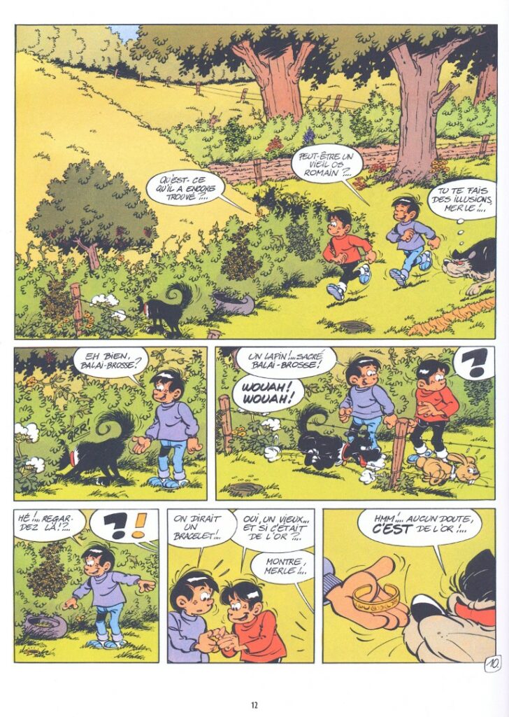 Merle vient passer quelques jours de vacances chez Yvain et Yvon, avec son chien Balai-brosse. Il fait beau. Balades en forêt et baignades dans le lac sont au programme. Merle sait que Yvon peut se métamorphoser en loup et devenir Ysengrin. Les jumeaux n’ont pas à cacher leur secret. A l’endroit où Balai-brosse débusque un lapin, les enfants découvrent un bracelet en or. Et si c’était une partie d’un trésor romain ? Il y a un tumulus pas loin, abritant une tombe de l’époque gallo-romaine. Nos amis vont déposer leur découverte au commissariat. Pour les forces de l’ordre, pas de doute, il y a un rapport avec les fouilleurs clandestins soupçonnés de tenter de piller le tumulus du grand romain.