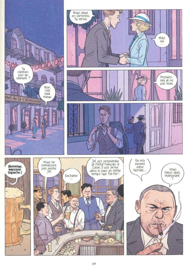 Tout le monde connaît Georges Simenon, auteur des enquêtes du célèbre Commissaire Maigret. Mais il serait fort réducteur de le cantonner à cette seule paternité. En adaptant ses romans noirs, les éditions Dargaud mettent en exergue la riche littérature de l’écrivain. Parmi eux, Quartier Nègre est paru en 1935. Le dessinateur espagnol Javi Rey l’ayant découvert dans son pays sous le titre Barrio Negro, c’est celui-ci qui a été conservé pour la bande dessinée. A l’époque, Simenon s’inspire de ses voyages pour écrire. Cette histoire est celle d’un déclassement social et d’un homme qui décide de tourner le dos au destin. C’est l’histoire d’un couple qui tente de surnager et qui petit à petit se délite. C’est une histoire d’amour(s) avec, en sous-jacent, la démonstration des limites du colonialisme. Simenon observe le monde en même temps qu’il analyse le couple, et l’on sait qu’il en avait une vision bien à lui, l’homme ayant multiplié les conquêtes et les infidélités. José-Louis Bocquet, scénariste-adaptateur, prouve ici que la bande dessinée est un art qui permet aussi de rendre service à la littérature en lui offrant une vitrine telle que celle-ci. L’un et l’autre de ces arts se nourrissent.