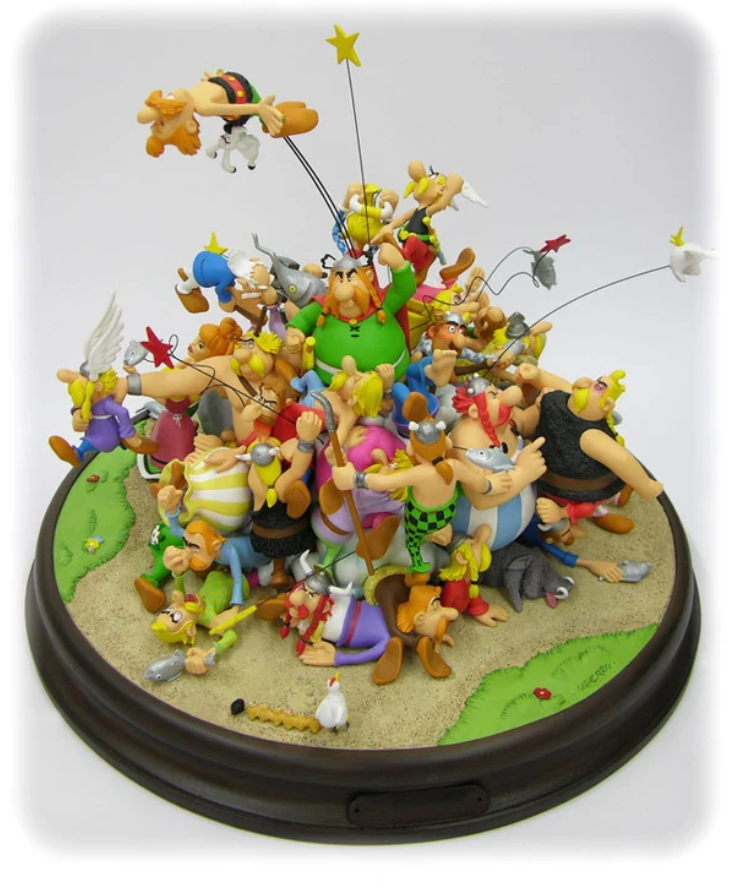 La bande dessinée se taille la part du lion, ou du requin plutôt. Pixi a produit une série d’Ordrafalbétix, le poissonnier du village d’Astérix. Si les figurines avec le personnage seul sont abordables (de 50 à 70 €), la scène de bagarre des villageois à coup de poissons pas frais sera dans votre salon pour pas moins de 1290 €. Chez Attakus, un requin en bronze monochrome dessiné par André Franquin dans Les Idées Noires est présenté sur socle avec une tige. Franquin est également à l’honneur avec des figurines issues des aventures de Spirou : Le repaire de la murène et Spirou et les hommes-bulles.