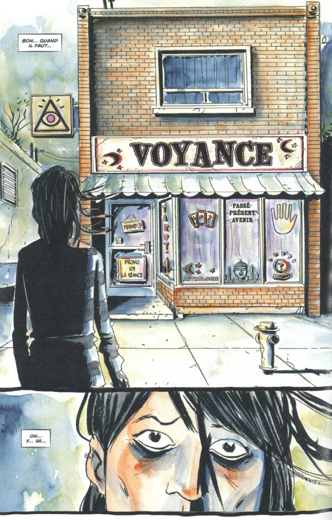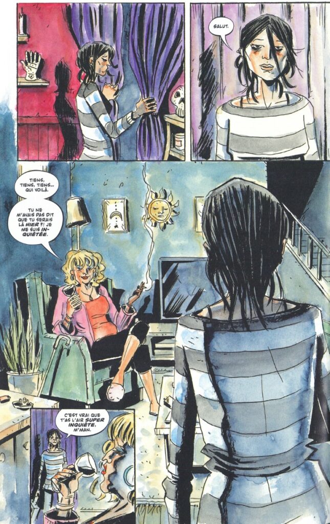 Après le succès de Sweet Tooth adapté pour Netflix, le dessinateur et scénariste Jeff Lemire est de retour avec une nouvelle série choc. L’auteur canadien verse dans l’occultisme et le tarot. Theresa est une jeune femme déjà meurtrie dans sa vie pourtant courte. Famille, amour, elle est en pleine recherche d’elle-même lorsqu’elle se découvre le pouvoir de rencontrer des morts et de revivre des scènes du passé qu’elle n’a pas vécues. Dans une mise en page somme toute classique pour un comics, Lemire montre son talent dans le découpage des scènes fantastiques : Theresa comme si elle faisait partie de cartes, Budd en NDE. Le graphisme semi-réaliste, le trait jeté et les couleurs aquarelles donnent à l’ensemble un ton spécifique, autre que si on était dans du réalisme pur. C’est toute la puissance du talent de Jeff Lemire.