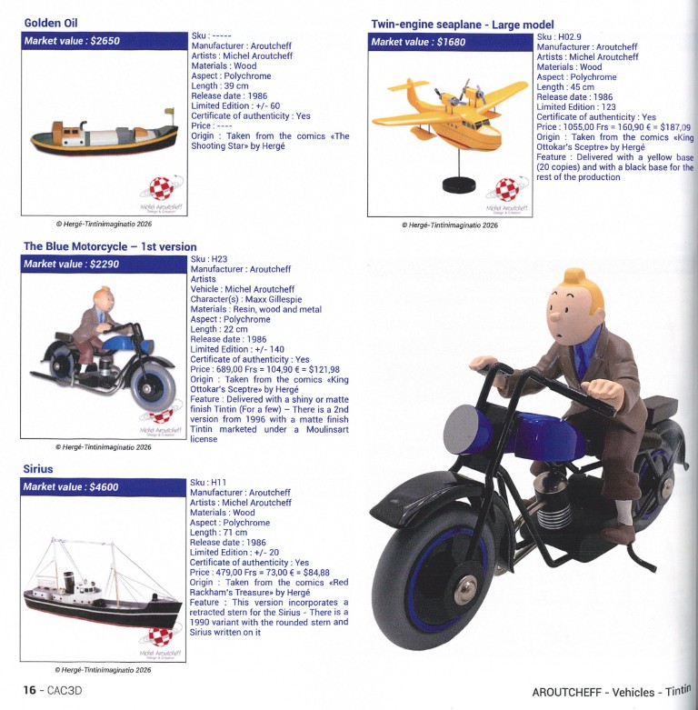 In my last column about the previous edition, I presented some of the most remarkable objects from the book. Let’s have a look at some new products that emerged since that edition. In a model released in April 2024, Tintin drives the Blue Torpedo of Doctor Finney, in a scene from Cigars of the Pharaoh. Produced by Tintinimaginatio, this polychrome model in resin and metal was printed in 1,250 copies and costs €1,295. The same company released in June 2023 a resin statuette of the Maharajah and his son, adapted from the poster for the exhibition ‘Tintin’s Imaginary Museum’; it measures 29 cm in resin, costs €315, and was sculpted by the Moulinsart workshop. On the cheaper side, at only €110, you can buy yourself Tintin riding a motorcycle in front of Snowy and the sprawling Thompsons, a scene from King Ottokar’s Sceptre, in resin and polychrome metal at 1/24 scale.